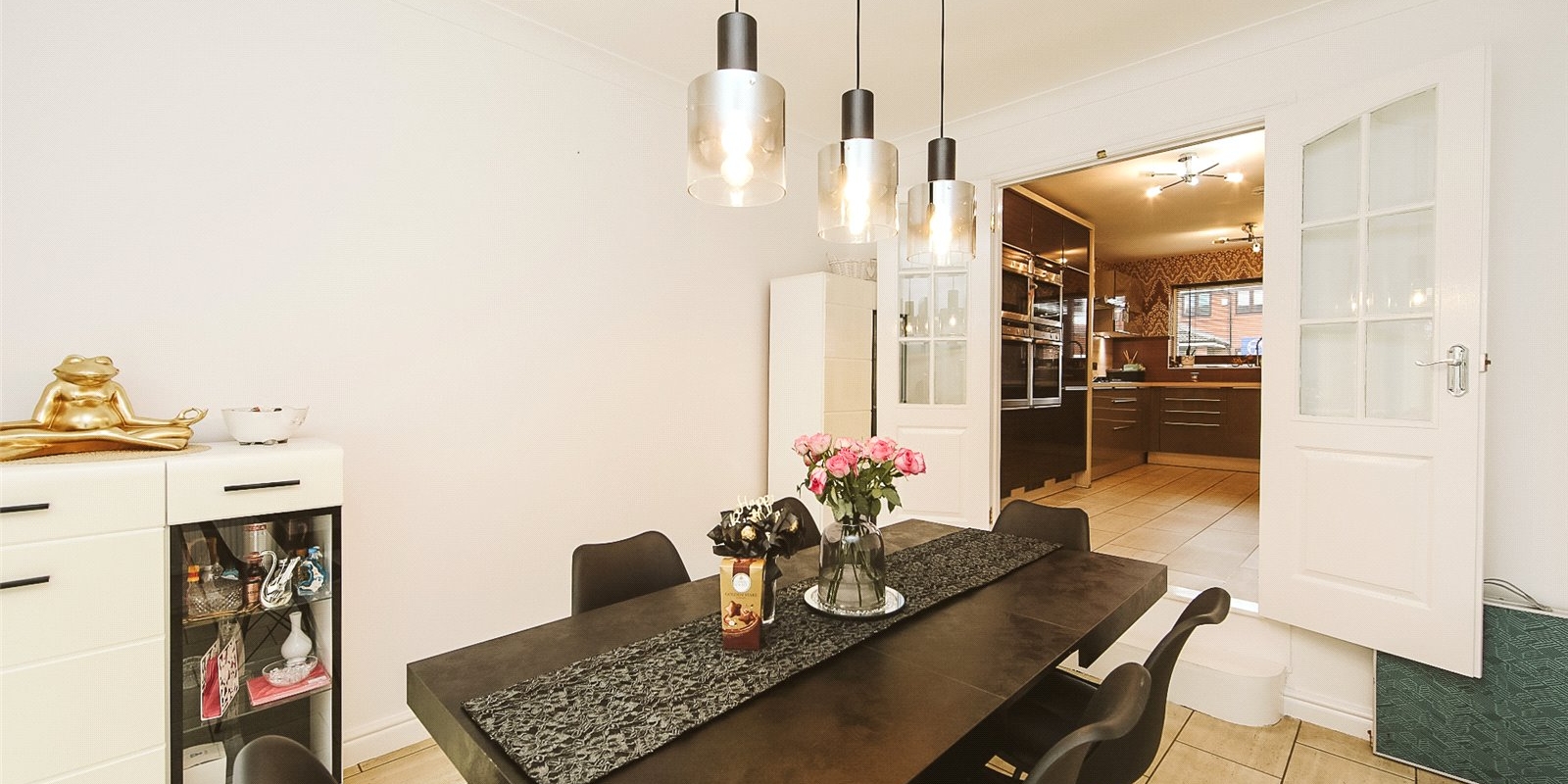 The ground floor features a welcome porch and entrance hallway, leading to a generous lounge with double doors opening into a bright sun room, perfect for relaxing and enjoying garden views. The dining room provides an excellent space for entertaining and flows seamlessly into a stylish modern kitchen fitted with quality units and ample workspace. A convenient WC and internal access to the integral garage complete the ground floor.