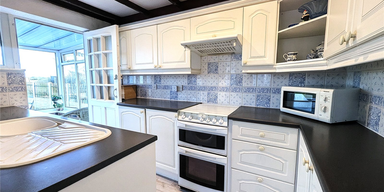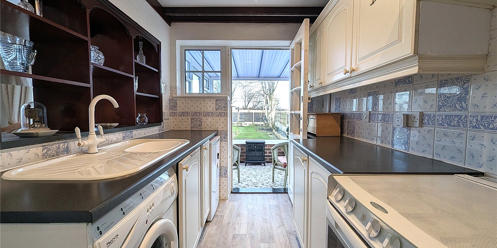 A family bathroom with feature window sits centrally within the accommodation, while to the rear of the property is a separate galley-style kitchen leading into an open-plan dining room with a comfortable lounge area. From the kitchen, a door leads through to a delightful sun room which overlooks the rear garden and the peaceful rural landscape beyond, providing an ideal spot to relax and enjoy the abundance of birds and local wildlife throughout the seasons.