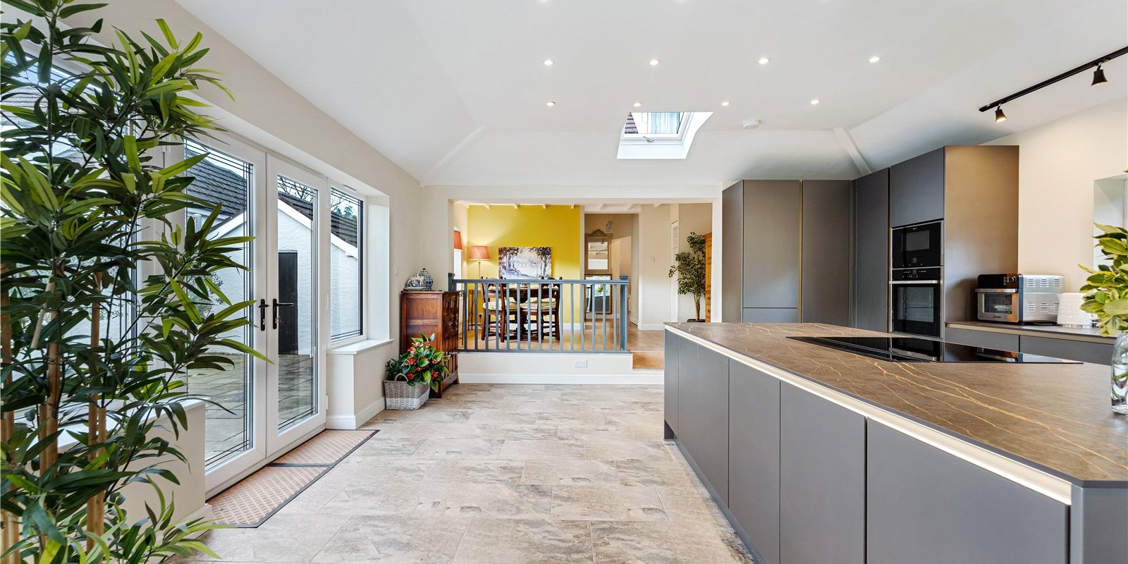 At the heart of the home is the stunning extended kitchen, finished to an exceptional standard with sleek modern cabinetry, premium built-in appliances, and high-quality fittings throughout. The kitchen is tiered, creating a natural separation between cooking and dining areas, with ample space for a dining table. A striking feature is the innovative extractor that rises seamlessly from the worktop, enhancing the clean, modern aesthetic.