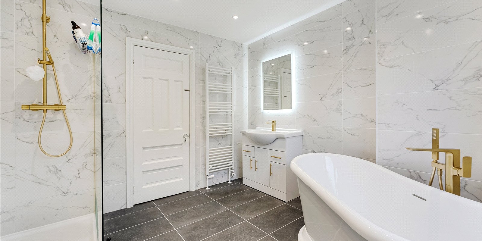 The ground floor further benefits from a luxurious modern bathroom, complete with a freestanding bath, a walk-in shower, and contemporary fittings. A separate utility room adds valuable practicality and storage.