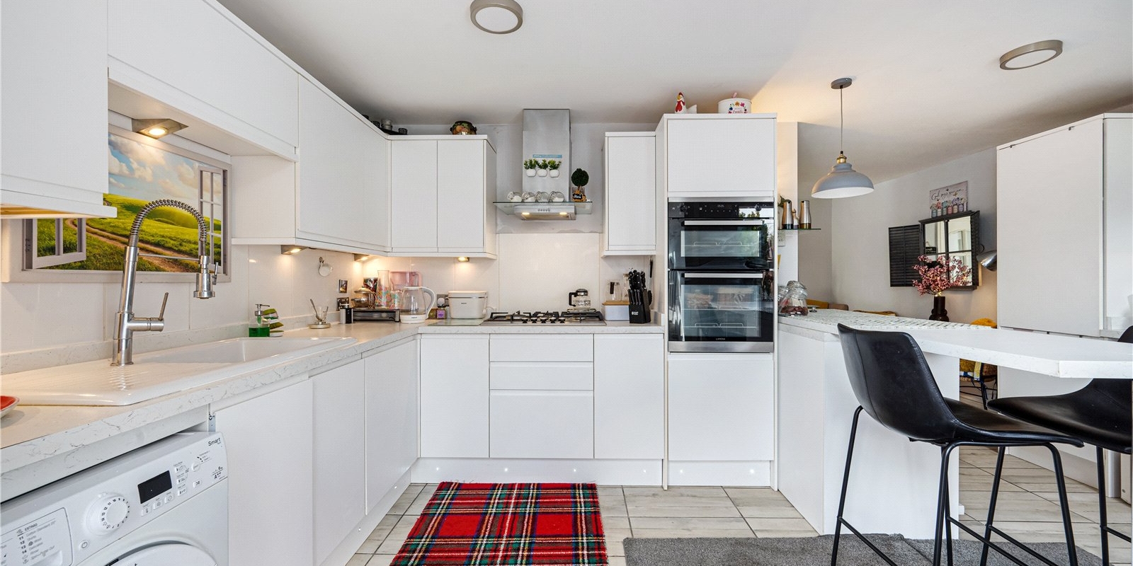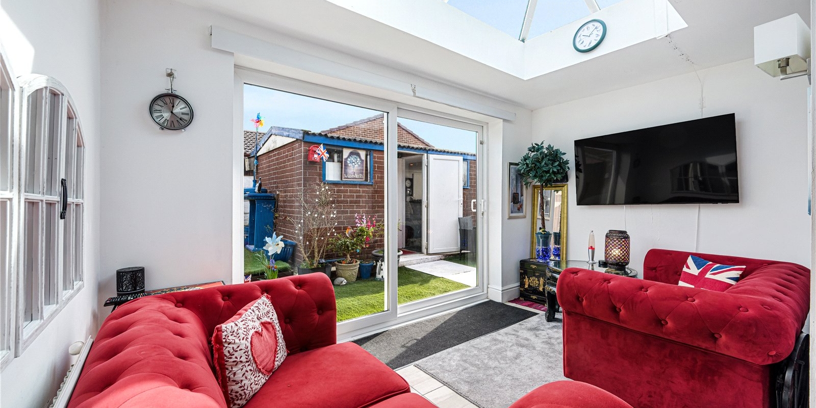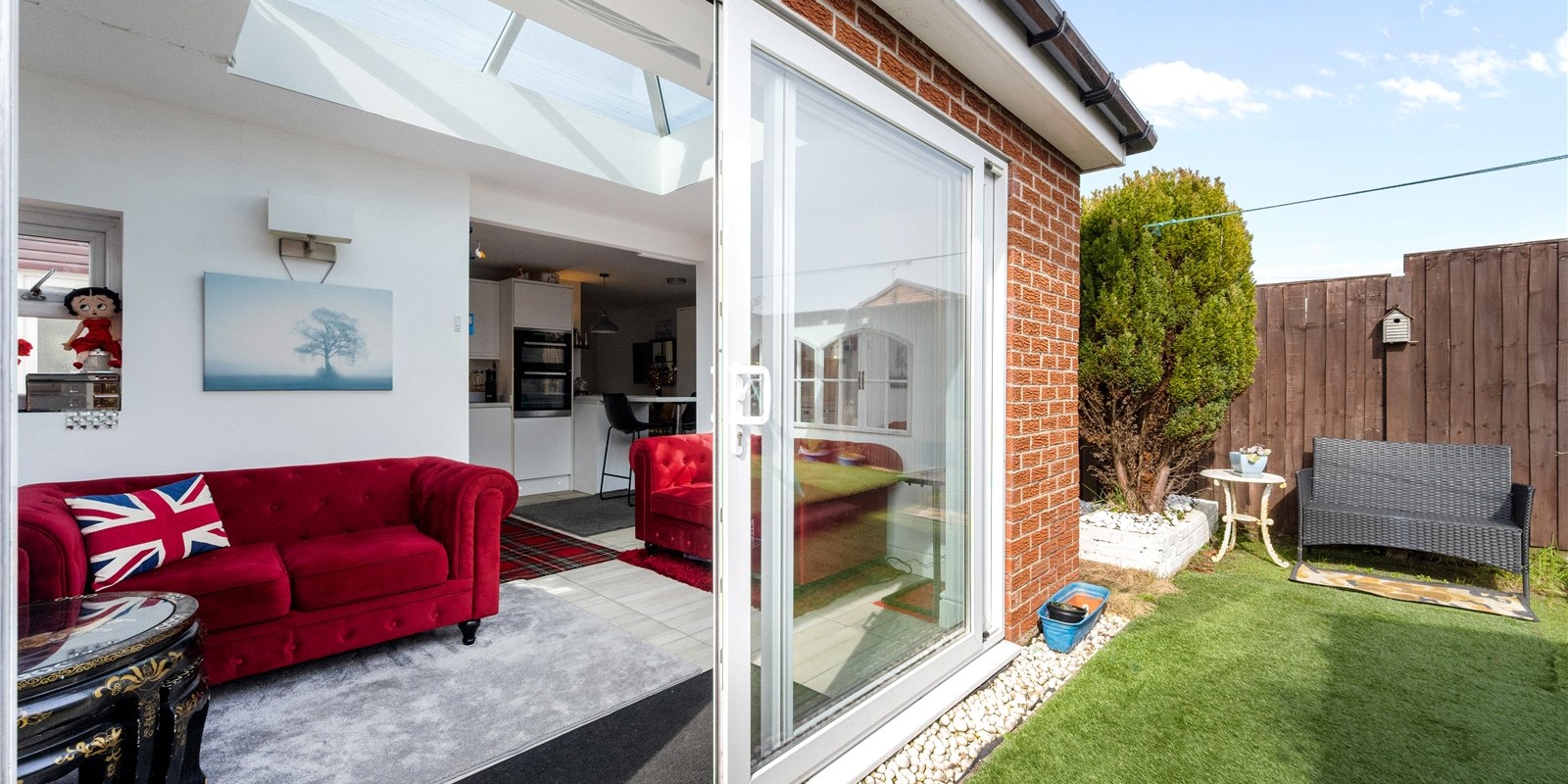 Inside, the home features a bright and airy open-plan sitting room, enhanced by a stylish roof lantern that floods the space with natural light, creating a warm and inviting atmosphere. The neutral kitchen complements the open layout, offering a clean and contemporary feel ideal for both everyday living and entertaining.