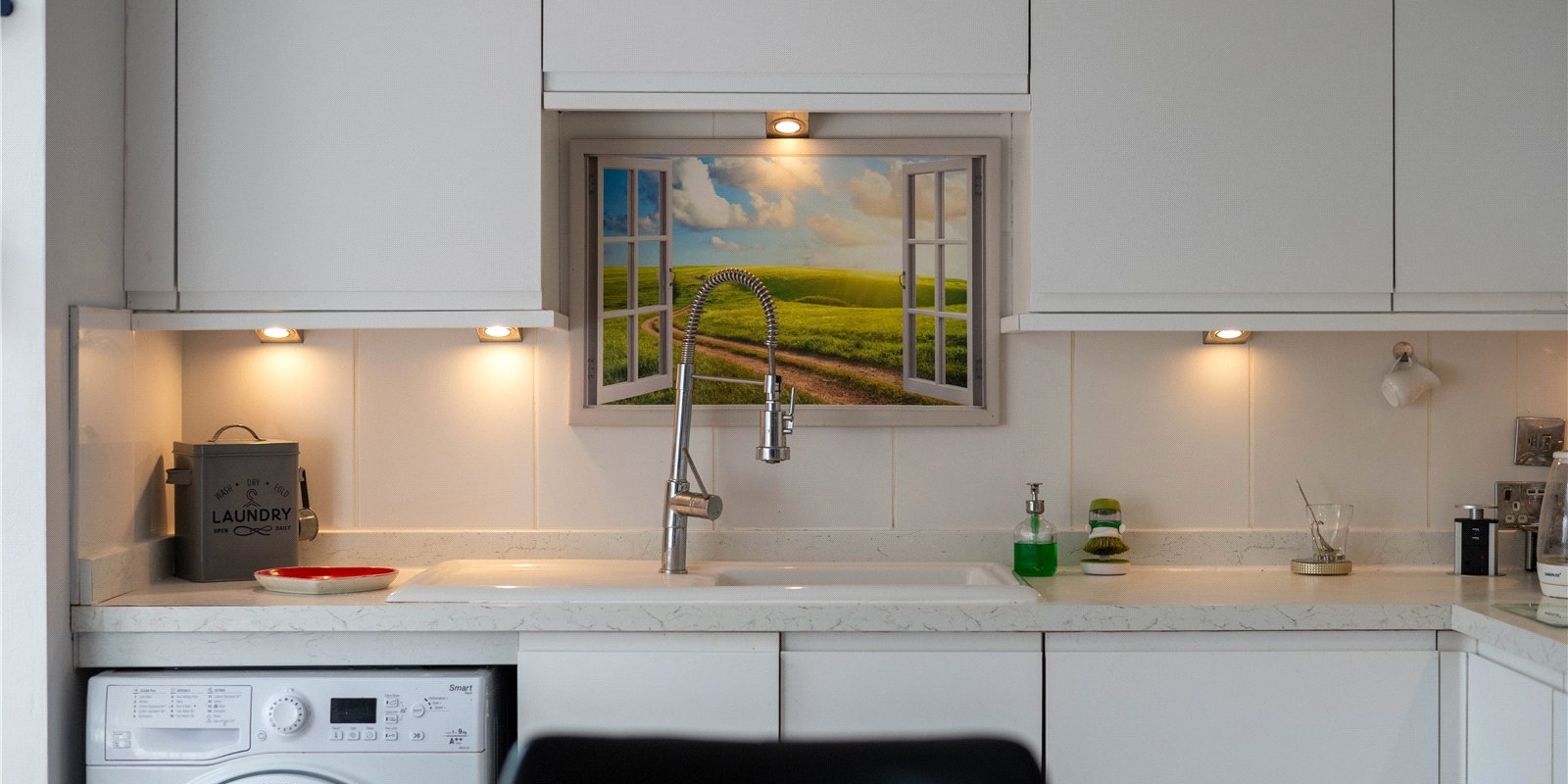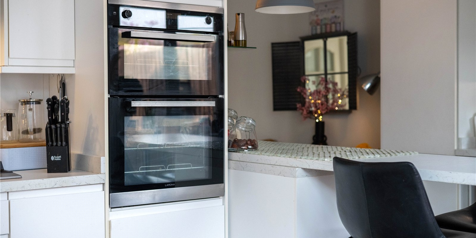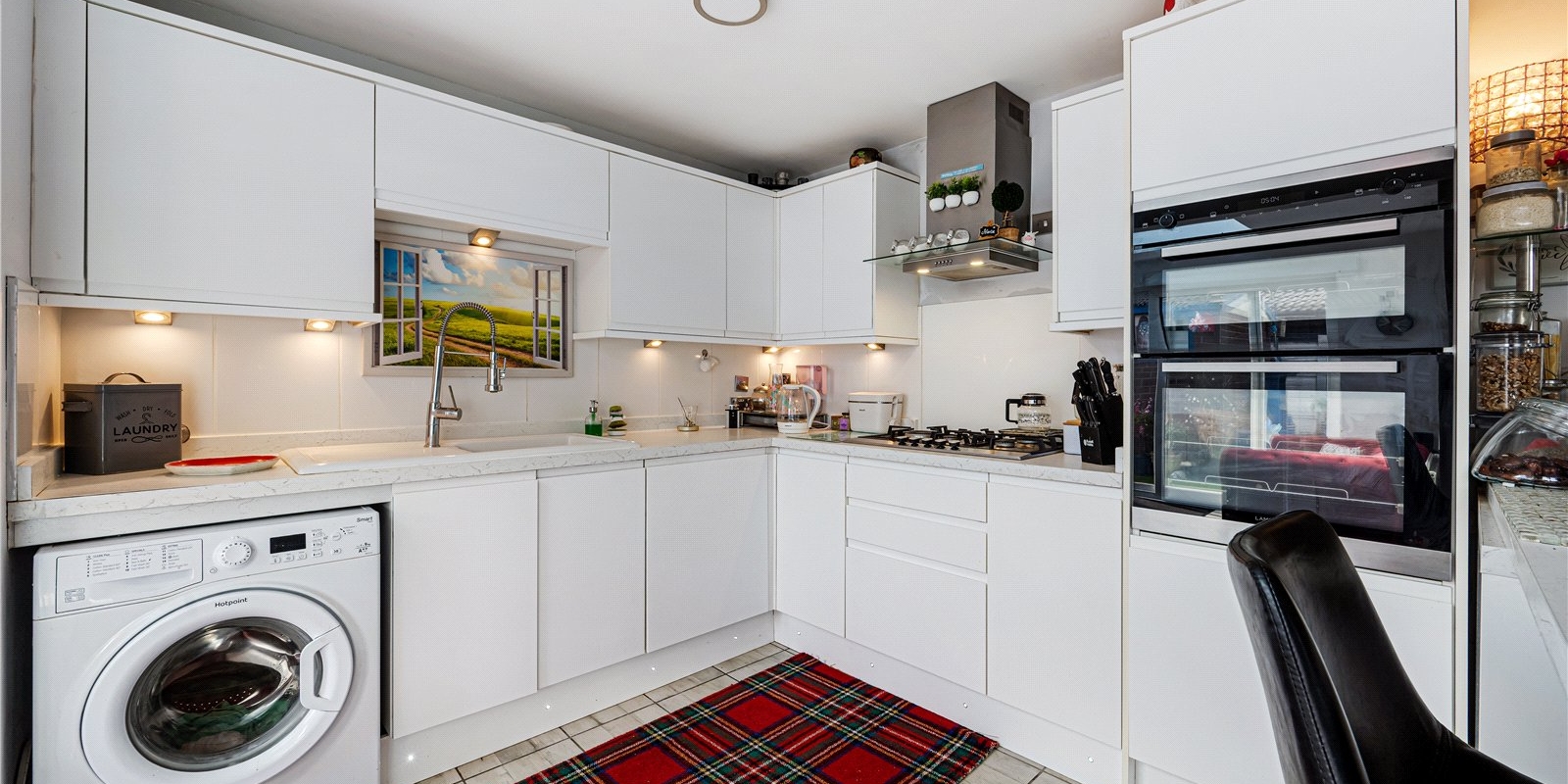 Inside, the home features a bright and airy open-plan sitting room, enhanced by a stylish roof lantern that floods the space with natural light, creating a warm and inviting atmosphere. The neutral kitchen complements the open layout, offering a clean and contemporary feel ideal for both everyday living and entertaining.