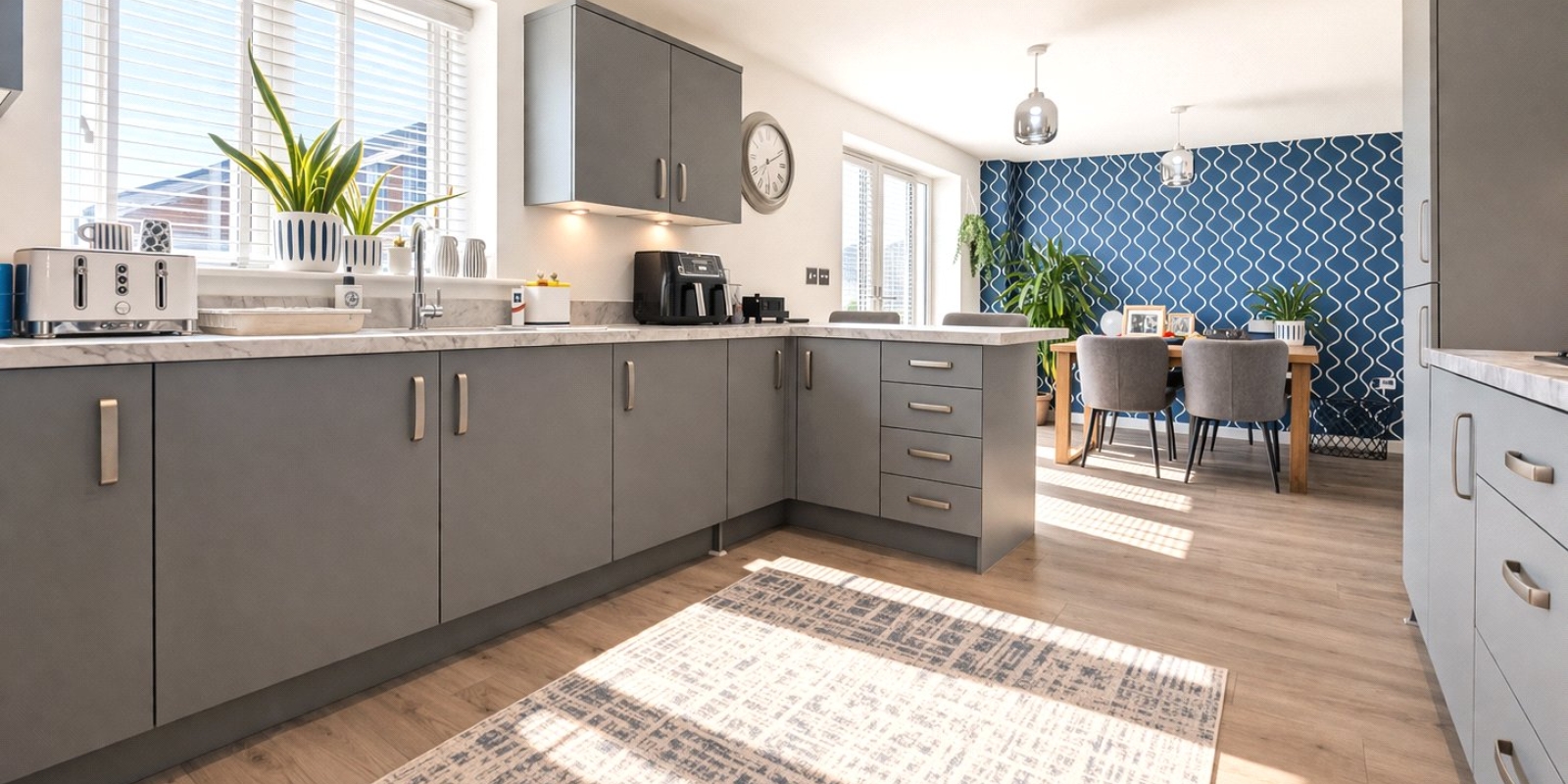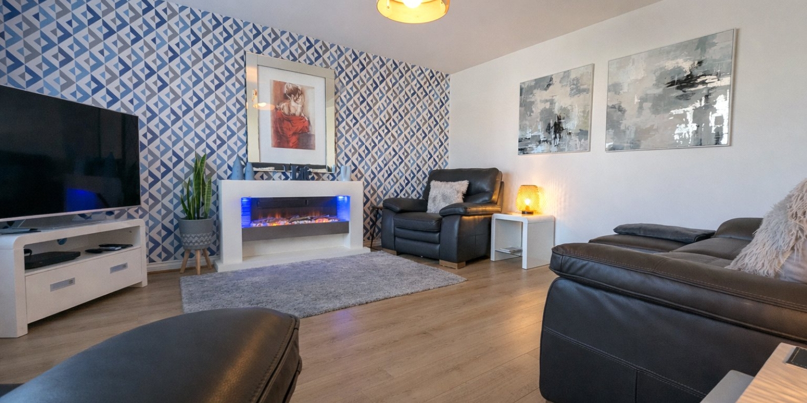 The property opens into a welcoming entrance hallway with useful storage, leading through to a spacious and well-proportioned lounge, providing a bright and comfortable living environment. To the rear, the open-plan kitchen and dining room has been thoughtfully improved with the addition of a modern kitchen island, creating a highly sociable and practical space ideal for both everyday living and entertaining.