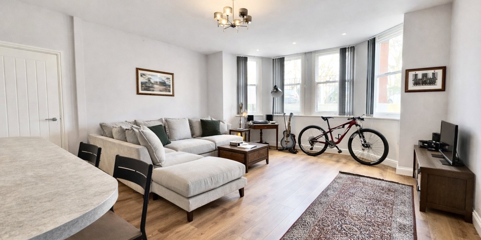 The heart of the apartment is the expansive open plan kitchen, living and dining area, a bright and versatile space with ample room for both comfortable seating and a full dining setup. Large proportions create an airy feel, while the layout allows for easy zoning of cooking, dining and relaxation areas.