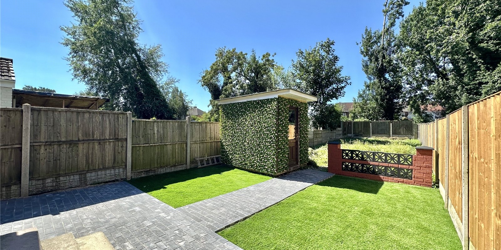 The rear of the property features a substantial garden, ideal for outdoor activities and gatherings. The garden includes a block-paved patio area, perfect for al fresco dining, and an expanse of artificial grass, ensuring low maintenance and year-round greenery. An outbuilding, equipped with electricity and lighting, provides additional versatile space for a home office, gym, or storage.
