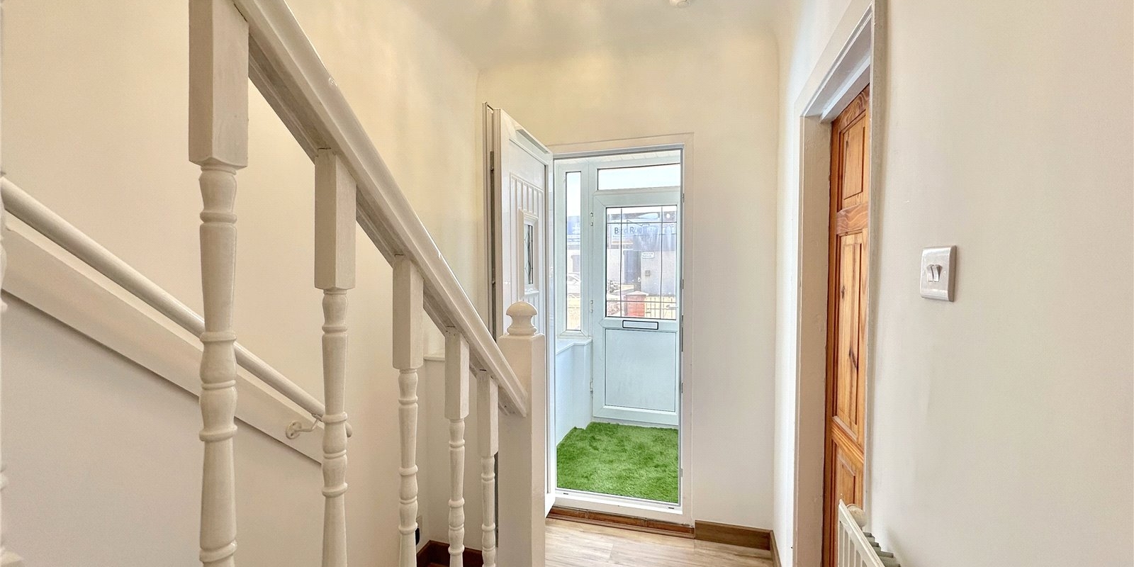 The property is approached via a meticulously maintained garden complemented by a lush artificial grass area, creating an inviting first impression.
