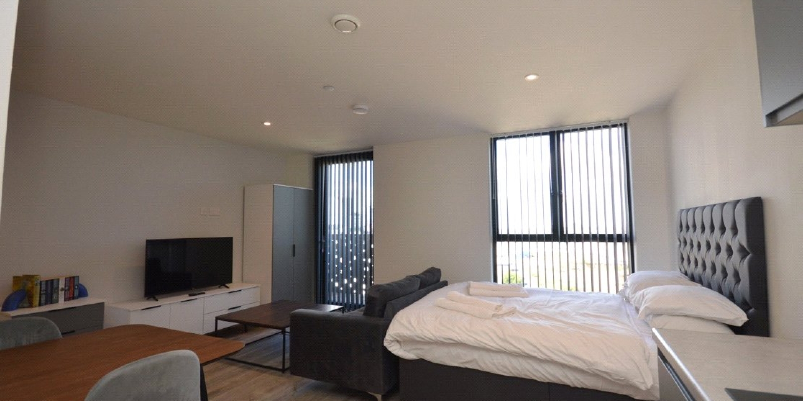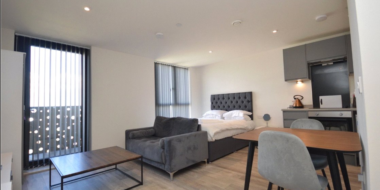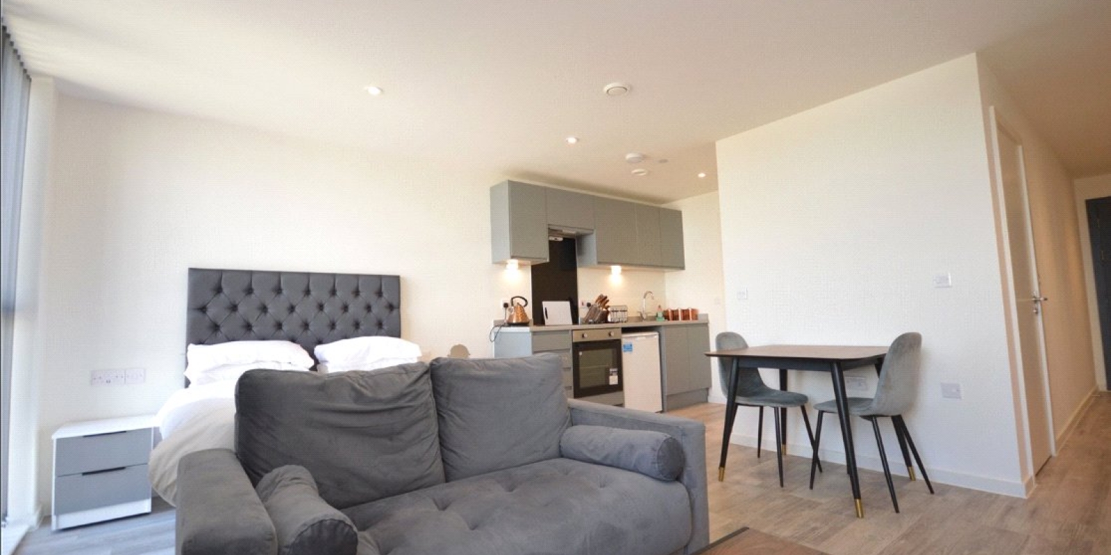 The sleek kitchen is fully equipped with high-quality integrated appliances, including an oven and hob making it both functional and stylish. The living area is bright and inviting, with ample space for relaxation, dining, and a comfortable sleeping area. Floor-to-ceiling windows allow plenty of natural light to flow in, while the private balcony provides the perfect spot to unwind and enjoy city views.