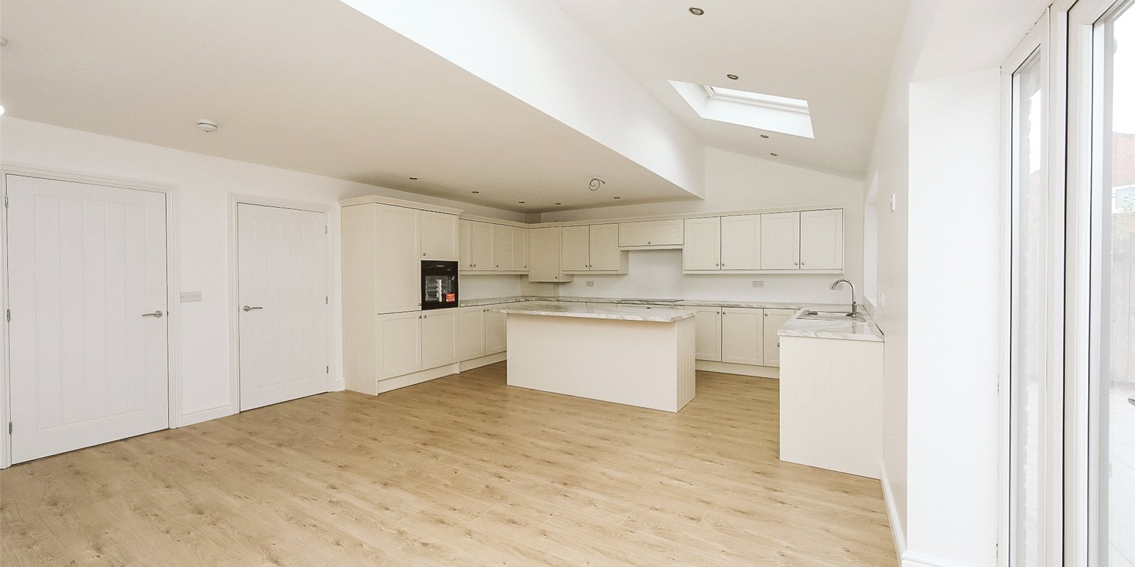Located in a sought-after residential area, the property features a private driveway and a welcoming entrance into a bright and airy interior. The heart of the home is the open-plan kitchen, dining, and living area, complete with Velux windows for added natural light.