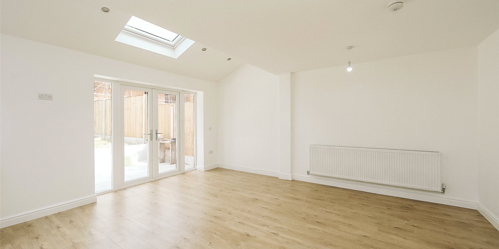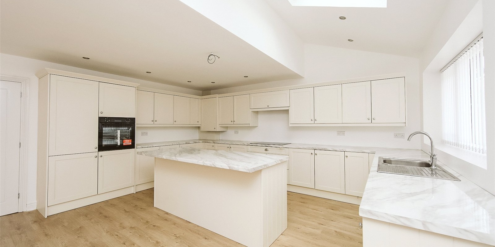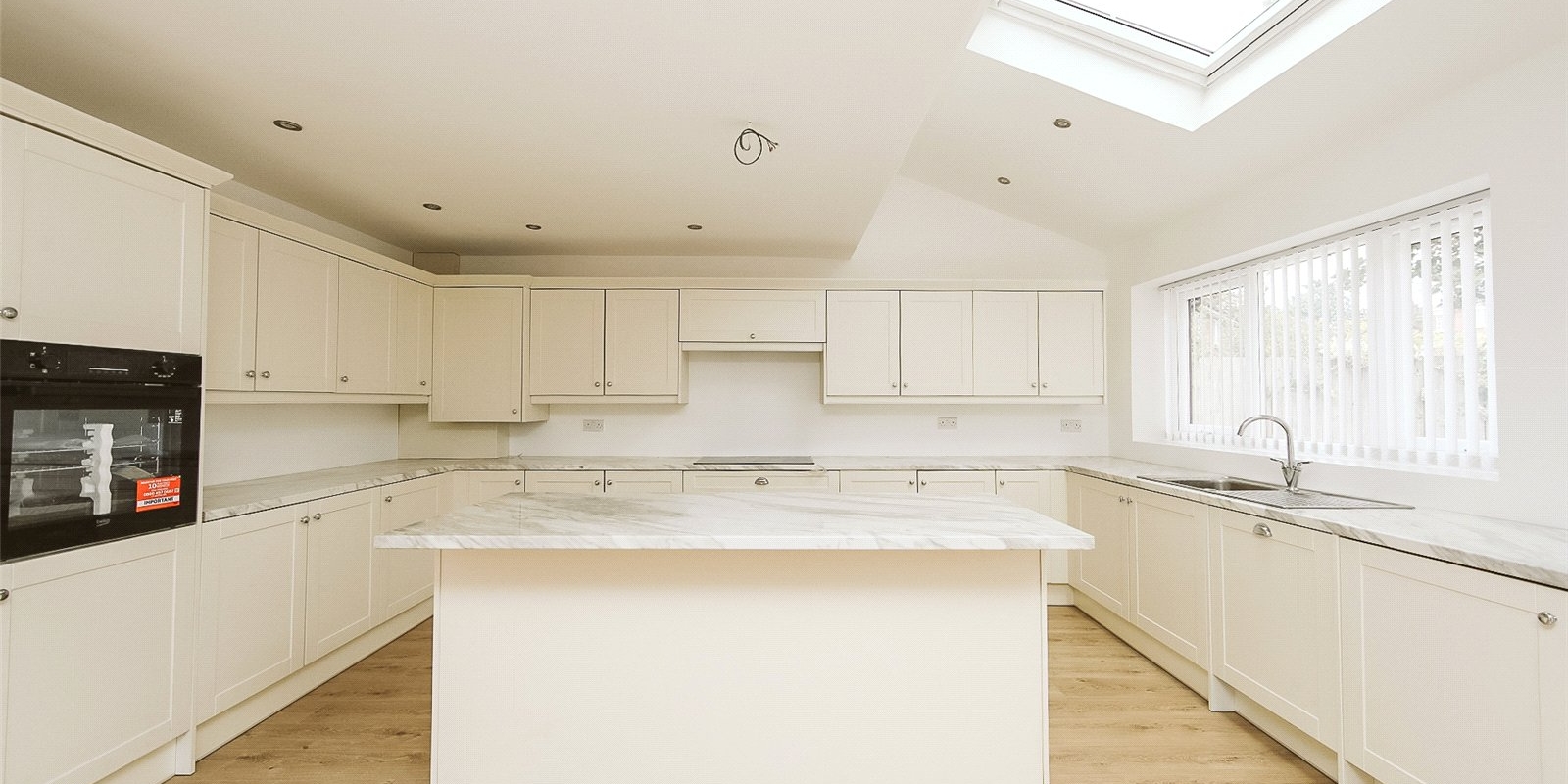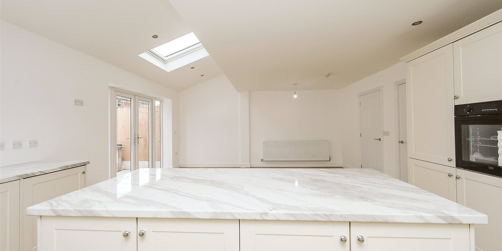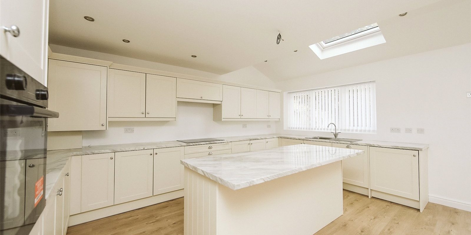 Step inside to a bright and welcoming entrance hall that sets the tone for the rest of the home. At its heart lies a stunning open-plan kitchen, dining, and living area — flooded with natural light thanks to Velux skylights and large windows. The contemporary kitchen features sleek, neutral-toned cabinetry, a central island, and fully integrated appliances, offering a stylish and functional space for everyday living and entertaining.