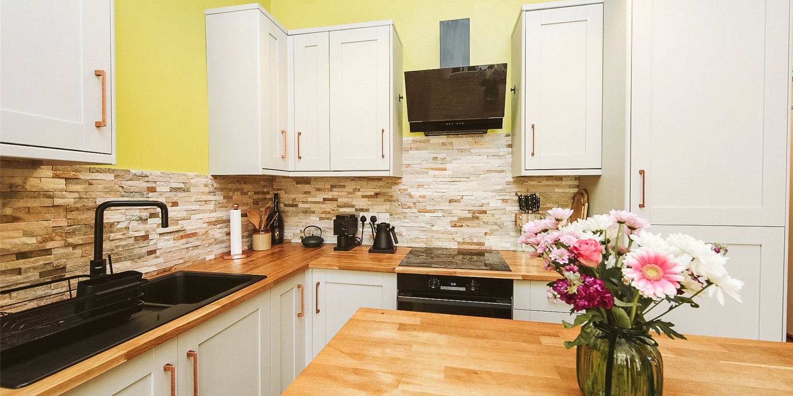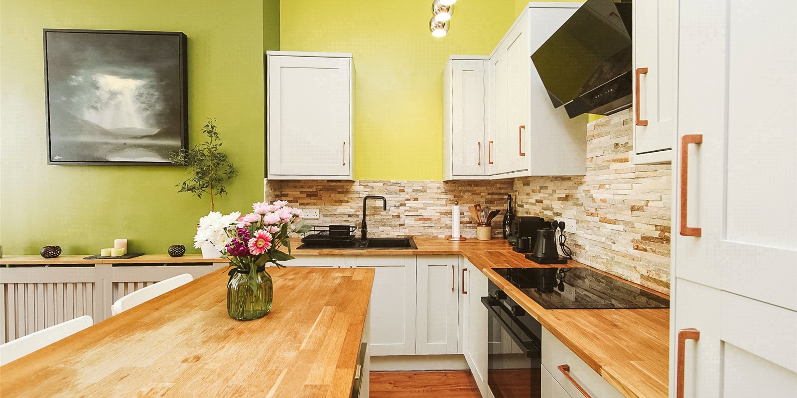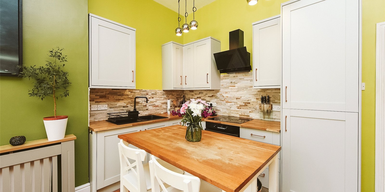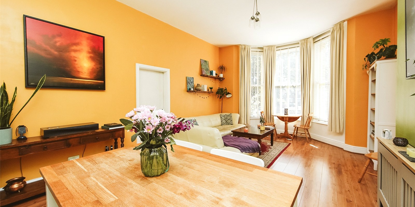 Step into a bright and spacious open-plan kitchen and dining area, flooded with natural light thanks to large bay windows. The newly fitted kitchen is a standout feature—elegantly designed with modern integrated appliances, wooden countertops, and sleek cabinetry, offering both functionality and a contemporary aesthetic. It’s the perfect space for cooking, dining, and entertaining.