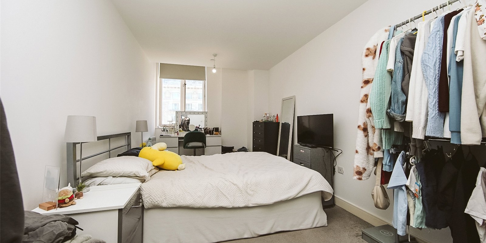 The large double bedroom offers a peaceful retreat, with ample space for storage, while additional built-in storage solutions throughout the flat help maximise space and functionality.