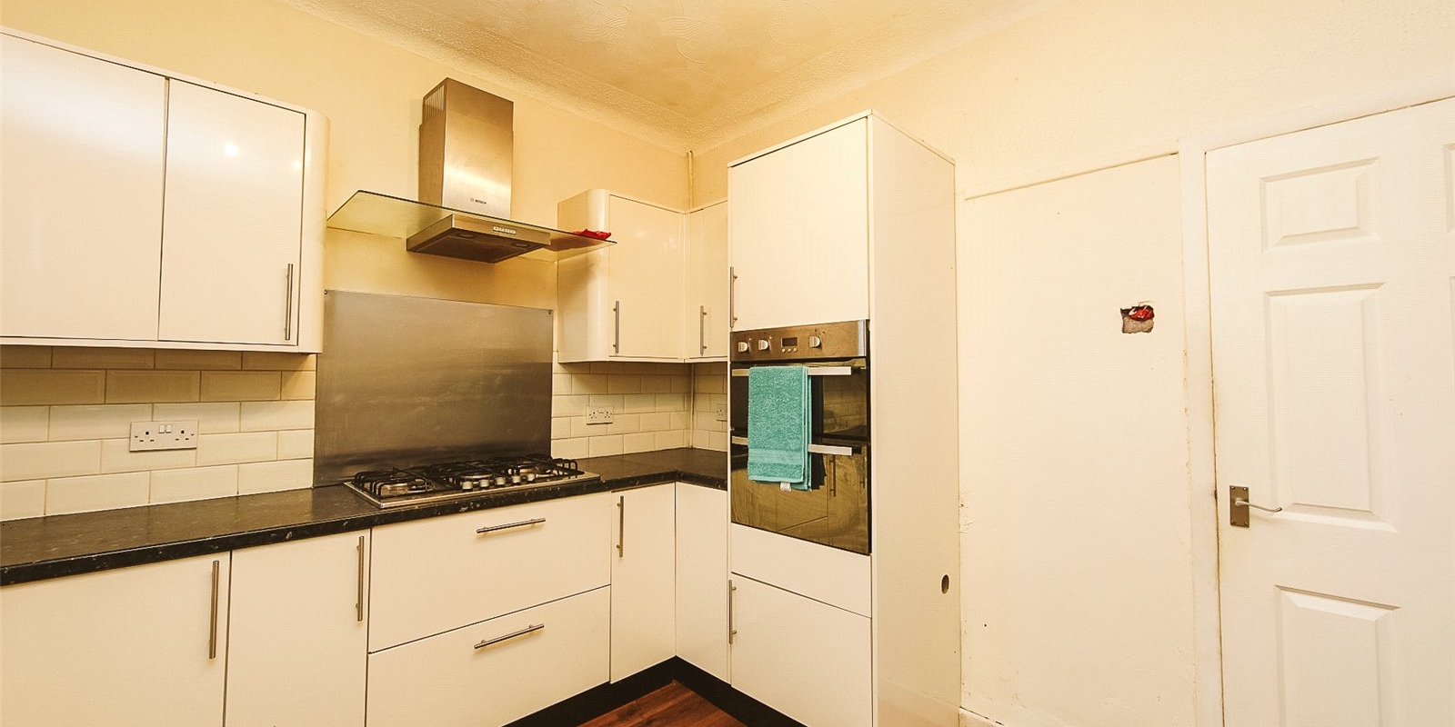 At the heart of the home lies the spacious dining kitchen, fitted with a range of matching wall and base units, a double oven, and a five-burner hob. The open-plan layout provides ample room for a family dining table - perfect for everyday living and mealtimes together.