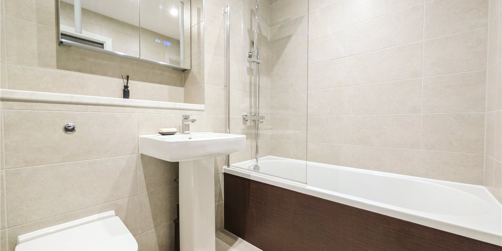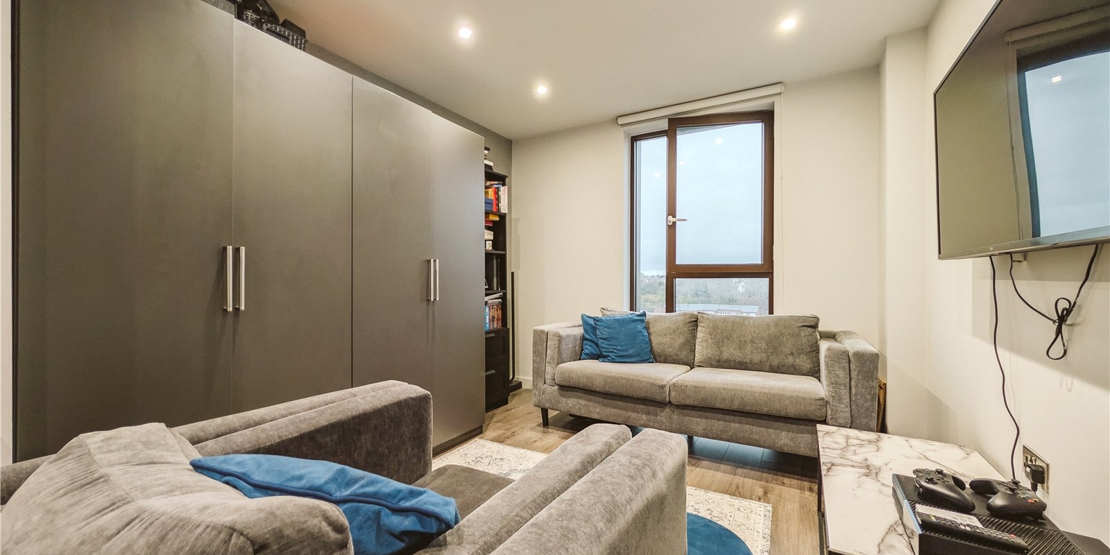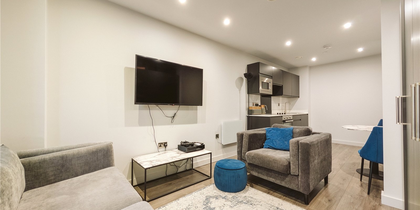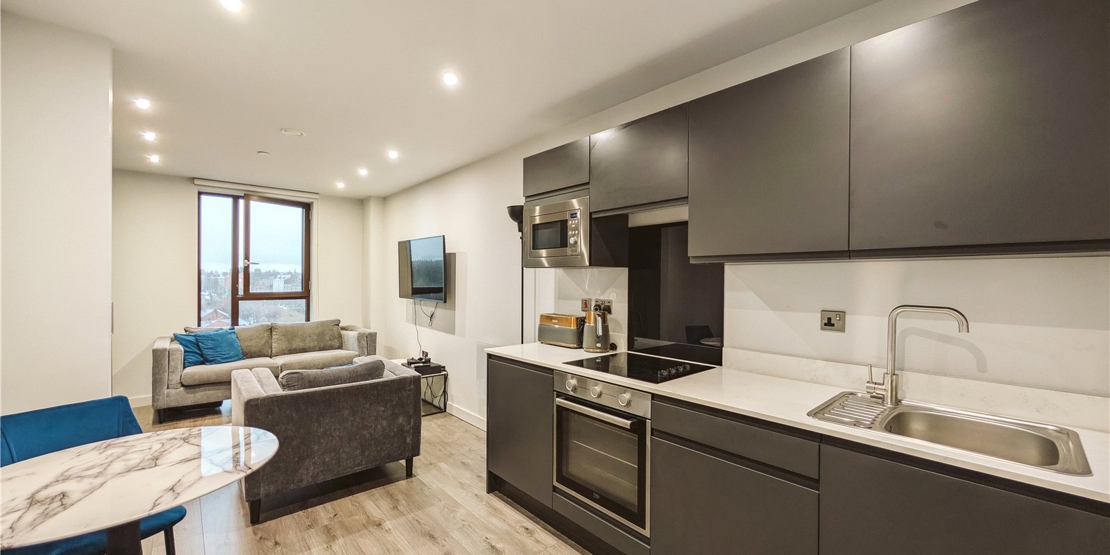 Venmore are delighted to offer this modern one bedroom apartment to the market. The primary living room is open and bright, with space for living and dining together. The open plan kitchen is smartly fitted with appliances and plenty of storage.