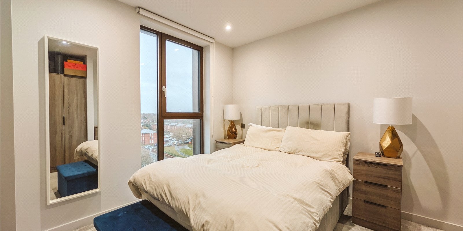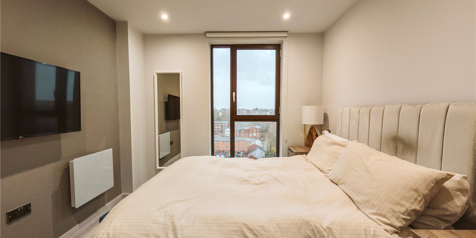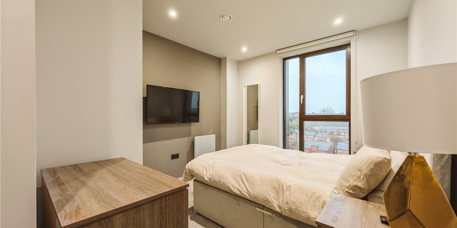 The bedroom is a generous double with built in storage and lovely plush carpet. The flat is completed with a high-quality bathroom suite with bath and shower, along with a large storage cupboard in the hall. Situated on the 10th floor, the apartment offers unparalleled views of both cathedrals.
