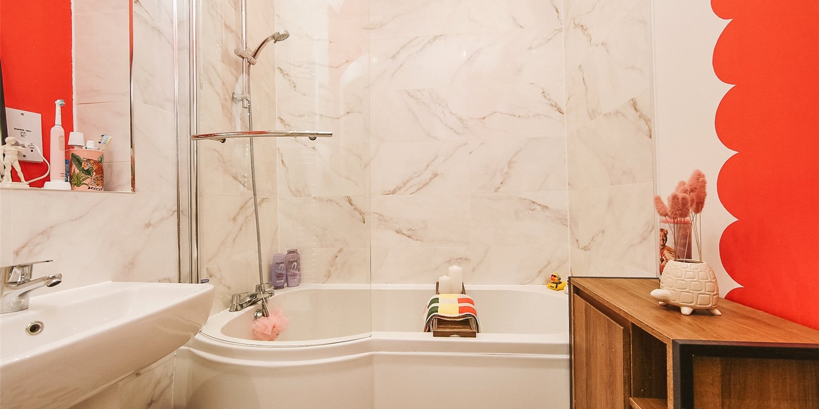 Modern three-piece bathroom suite, complete with bathtub and overhead shower