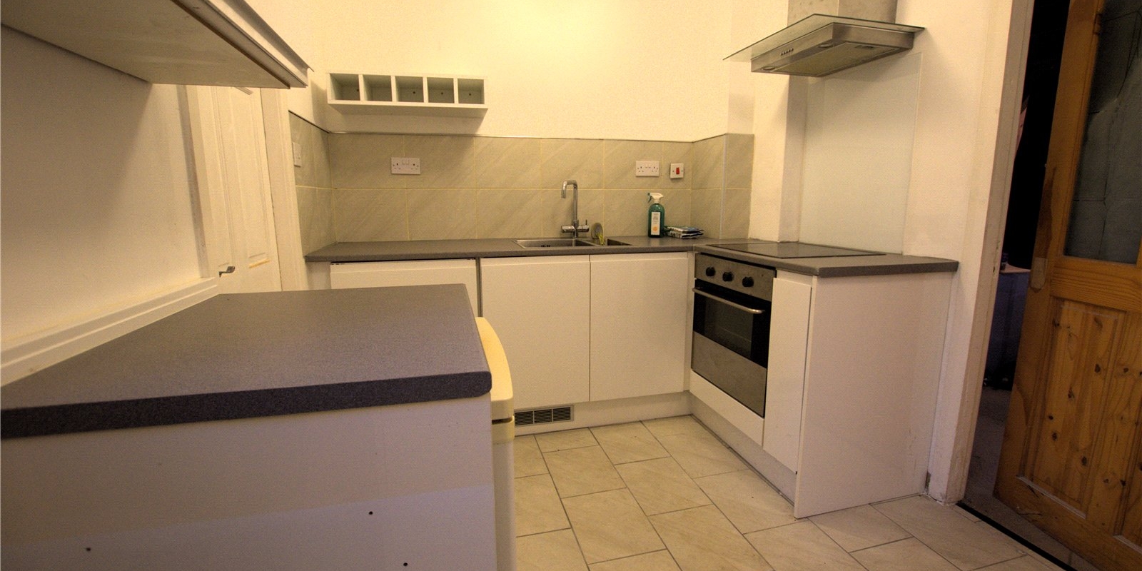 The kitchen is positioned to the rear and provides a functional workspace with direct access to the ground floor amenities. Upstairs, the property features two well-proportioned bedrooms—one large double and a second spacious single—both offering natural light and versatile layout options. A three-piece bathroom completes the first floor, with a compact yet efficient design.