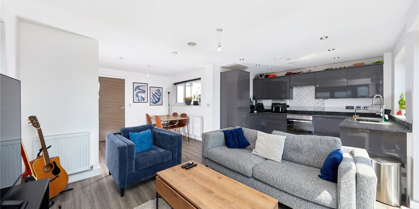 The sleek kitchen blends effortlessly into the living space, complete with high-spec, integrated appliances, modern cabinetry, and stone worktops. Whether you're cooking midweek meals or hosting a dinner party, this space is as practical as it is beautiful.