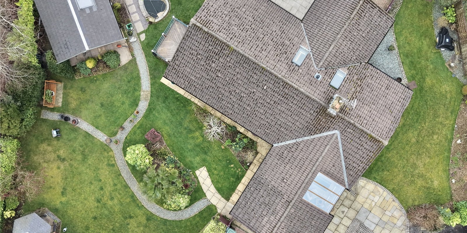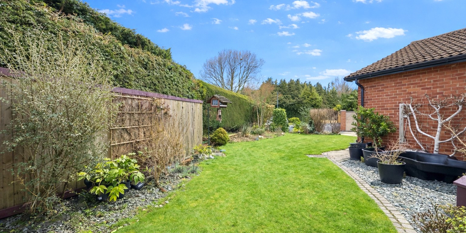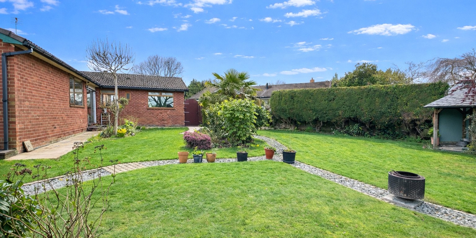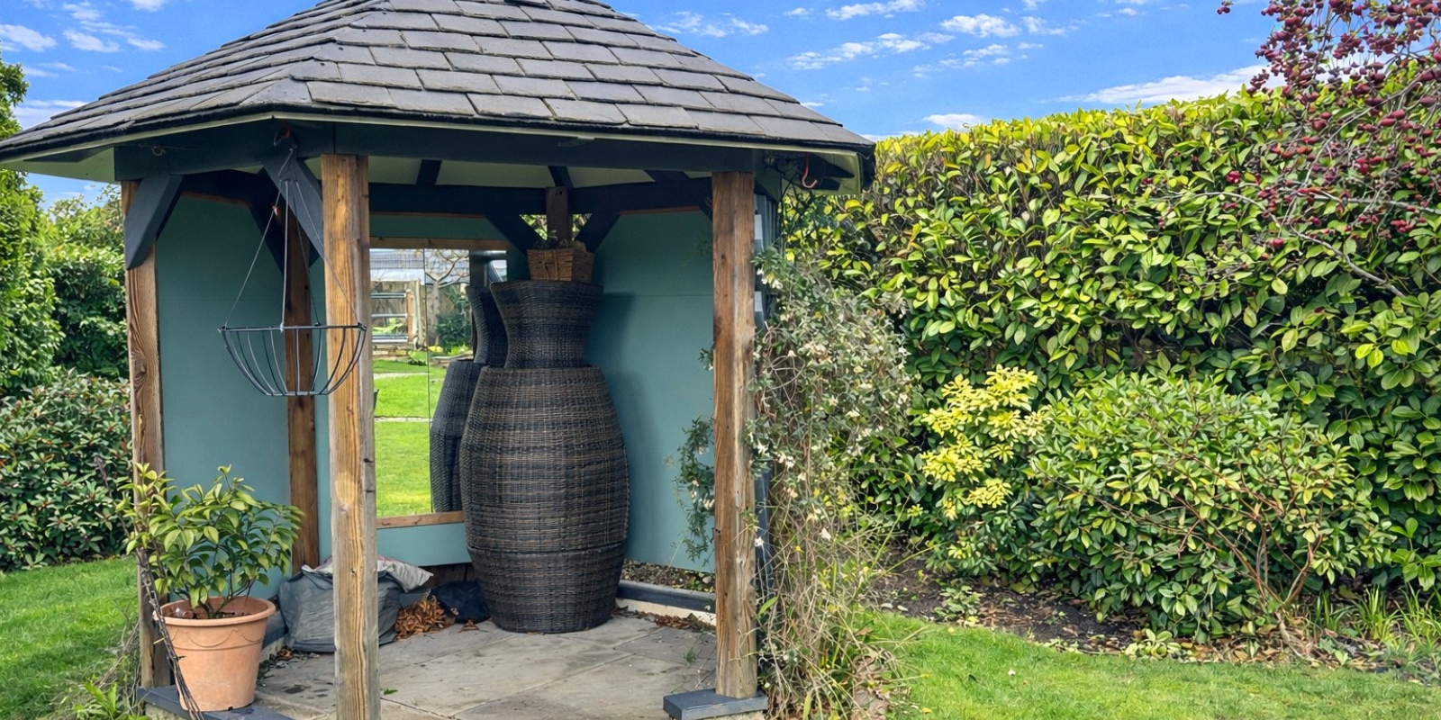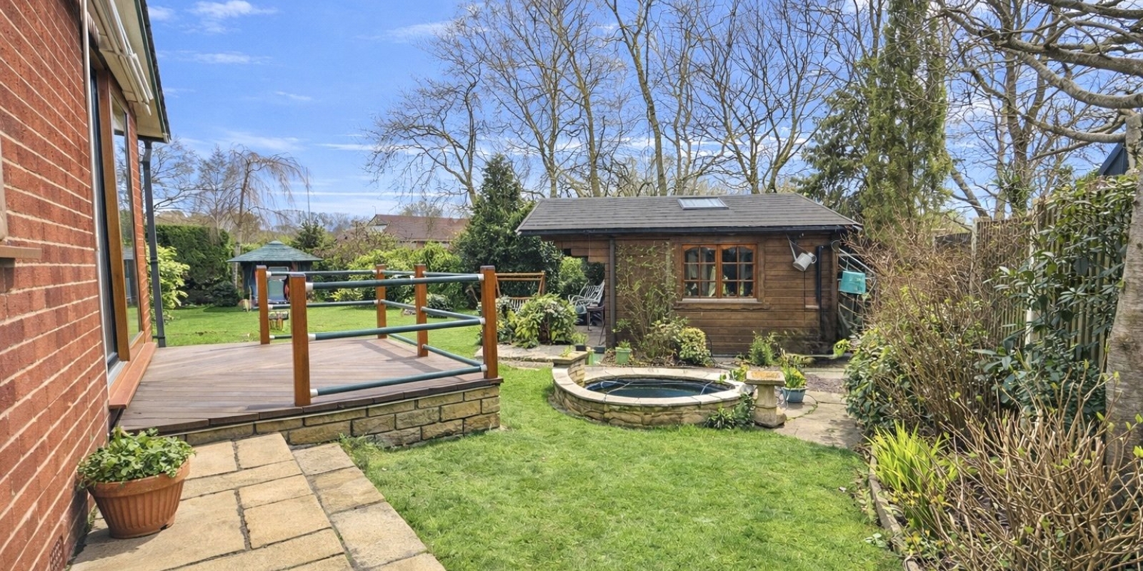 Externally, the property sits within stunning wrap-around gardens that have been thoughtfully landscaped and maintained. The outdoor space features a charming pond, well-stocked flower beds, a pavilion, and a well-built wooden cabin, creating a peaceful setting ideal for relaxing or entertaining.