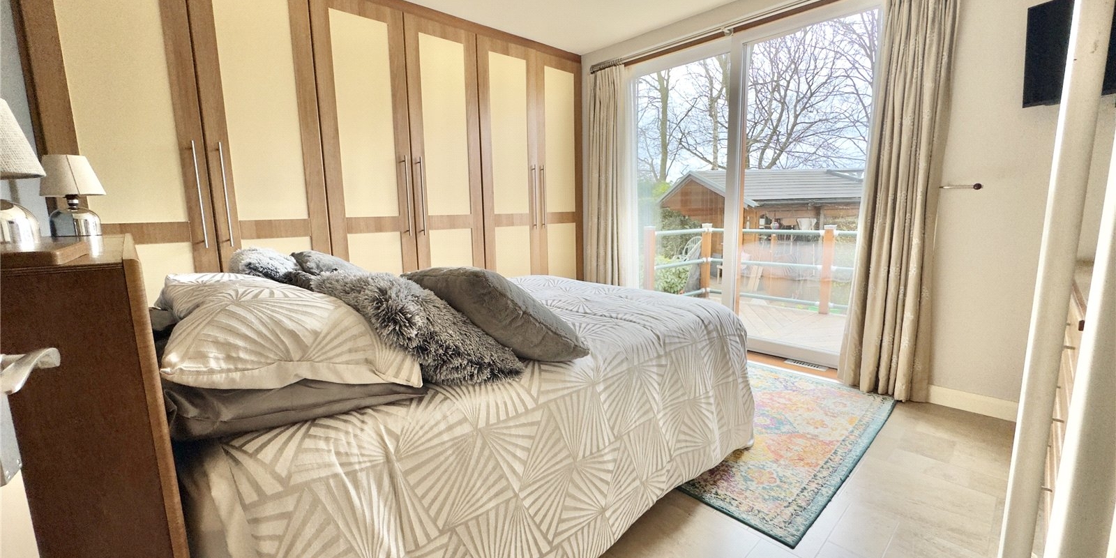 To the rear of the property there are three well-proportioned bedrooms. The master bedroom benefits from built-in wardrobes and doors opening out onto a private decked seating area. These bedrooms are served by a beautifully appointed four-piece family bathroom.