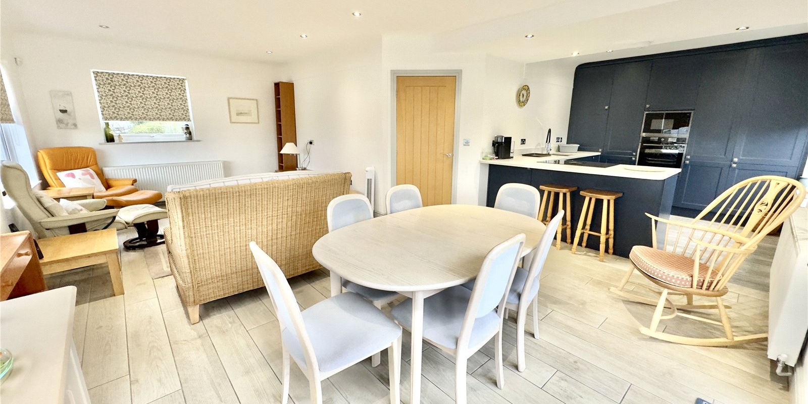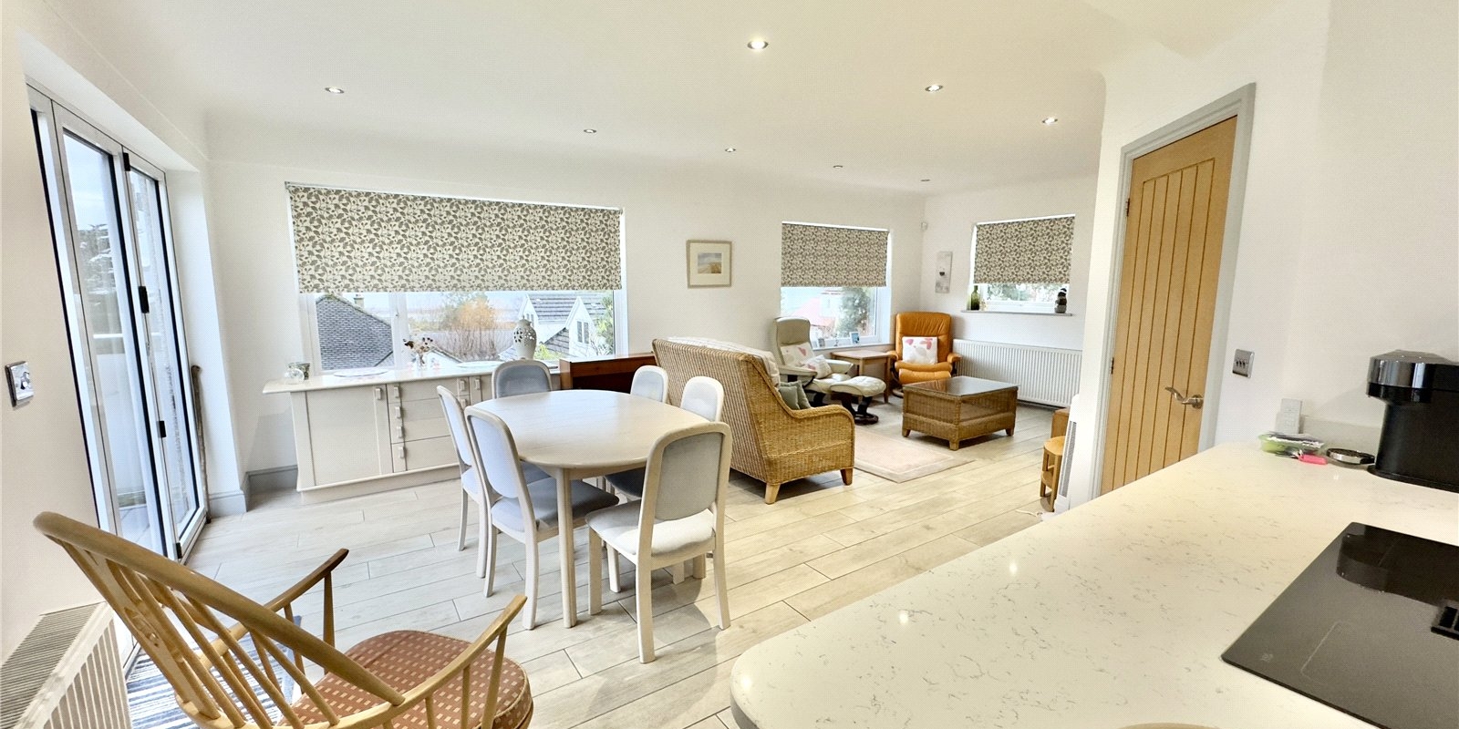 The accommodation is entered via a welcoming hallway which leads to the master bedroom, featuring built-in wardrobes and a modern en-suite shower room. There is a second double bedroom, also with built-in wardrobes, a third bedroom, and a contemporary second shower room. The main living area of the property is an impressive open-plan living, dining and kitchen space, designed to maximise the outstanding outlook. Bi-fold doors open onto a balcony that spans the full length of the bungalow, providing an ideal setting for entertaining or simply enjoying the panoramic views.
