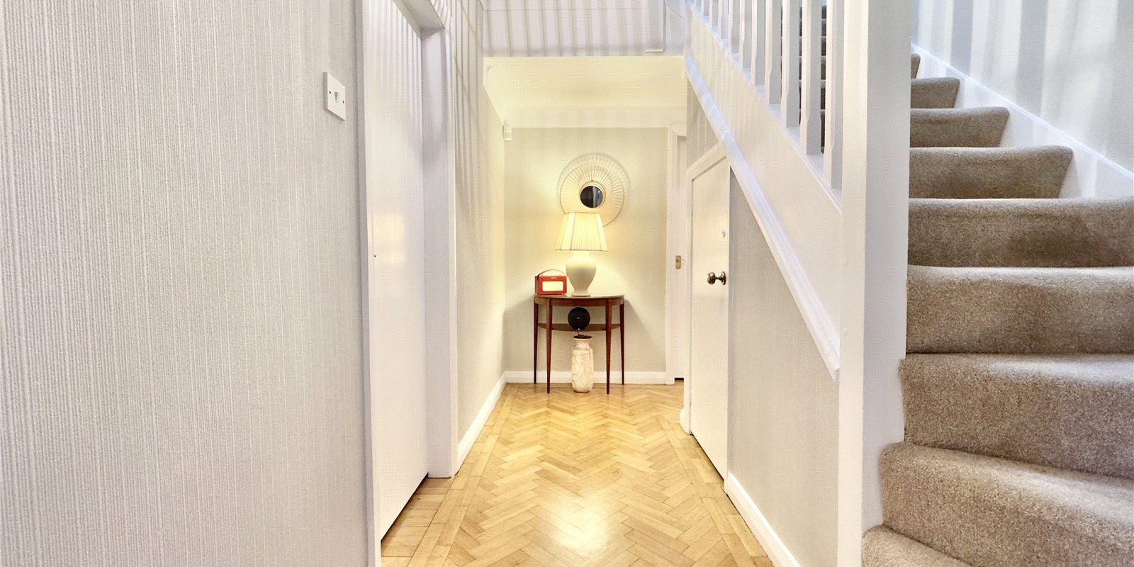 The ground floor is entered through a welcoming entrance hall. To the right is a spacious reception room featuring a bay window, parquet-style flooring, and a feature fireplace. Also to this side of the hallway is a convenient WC.