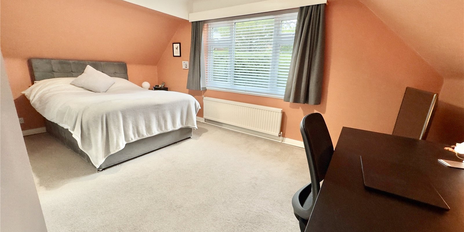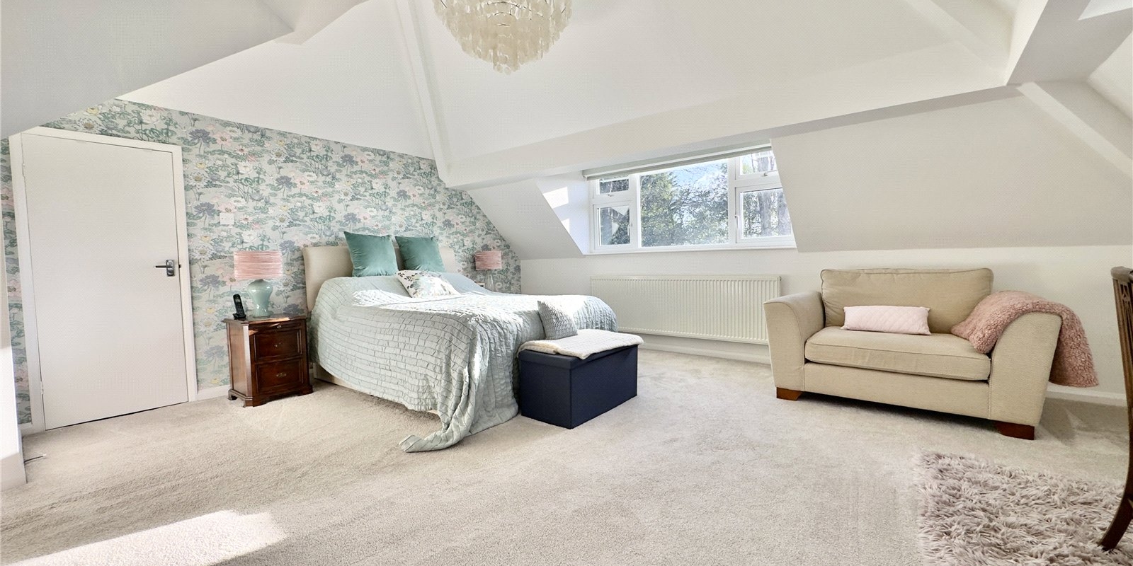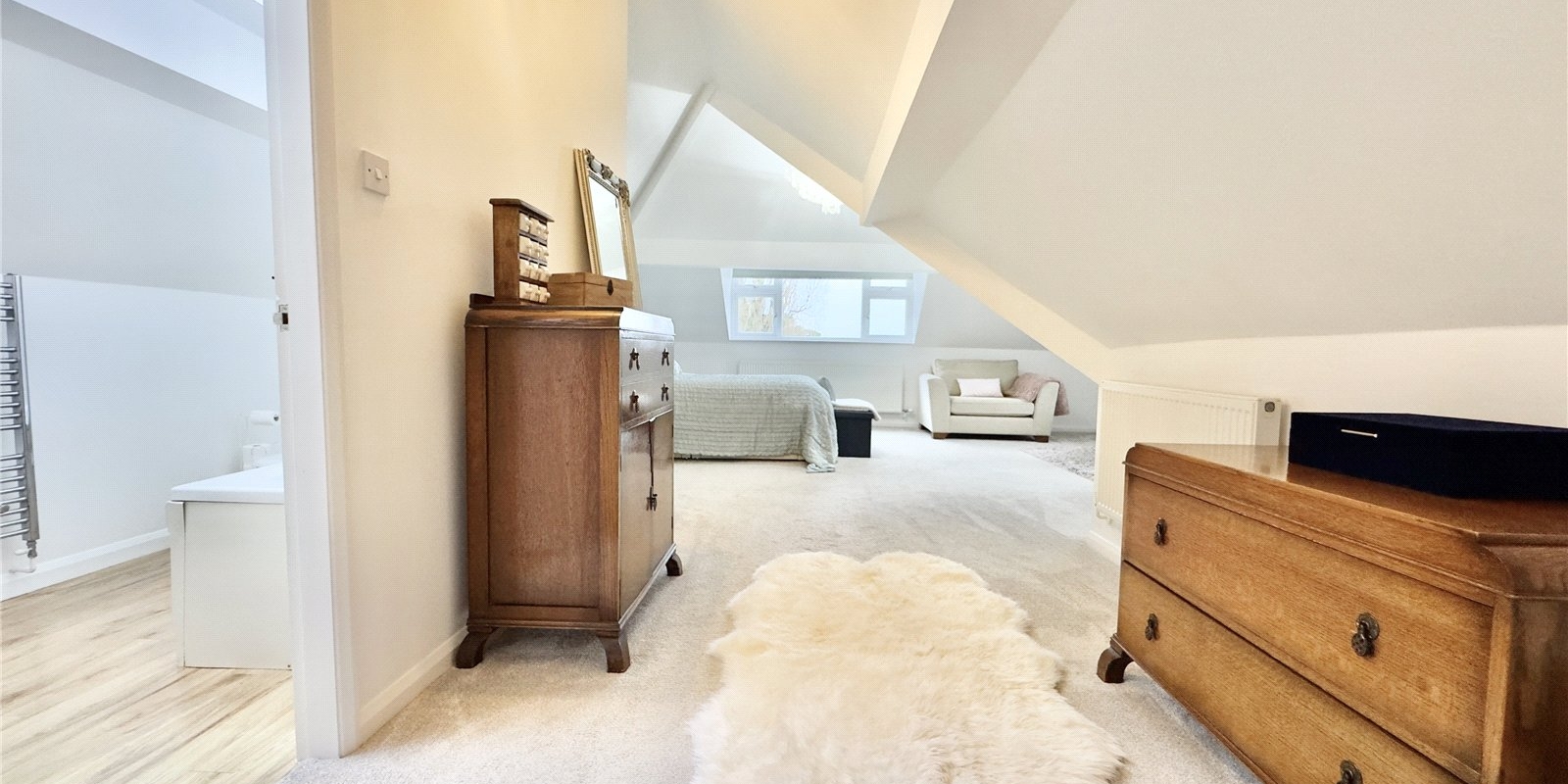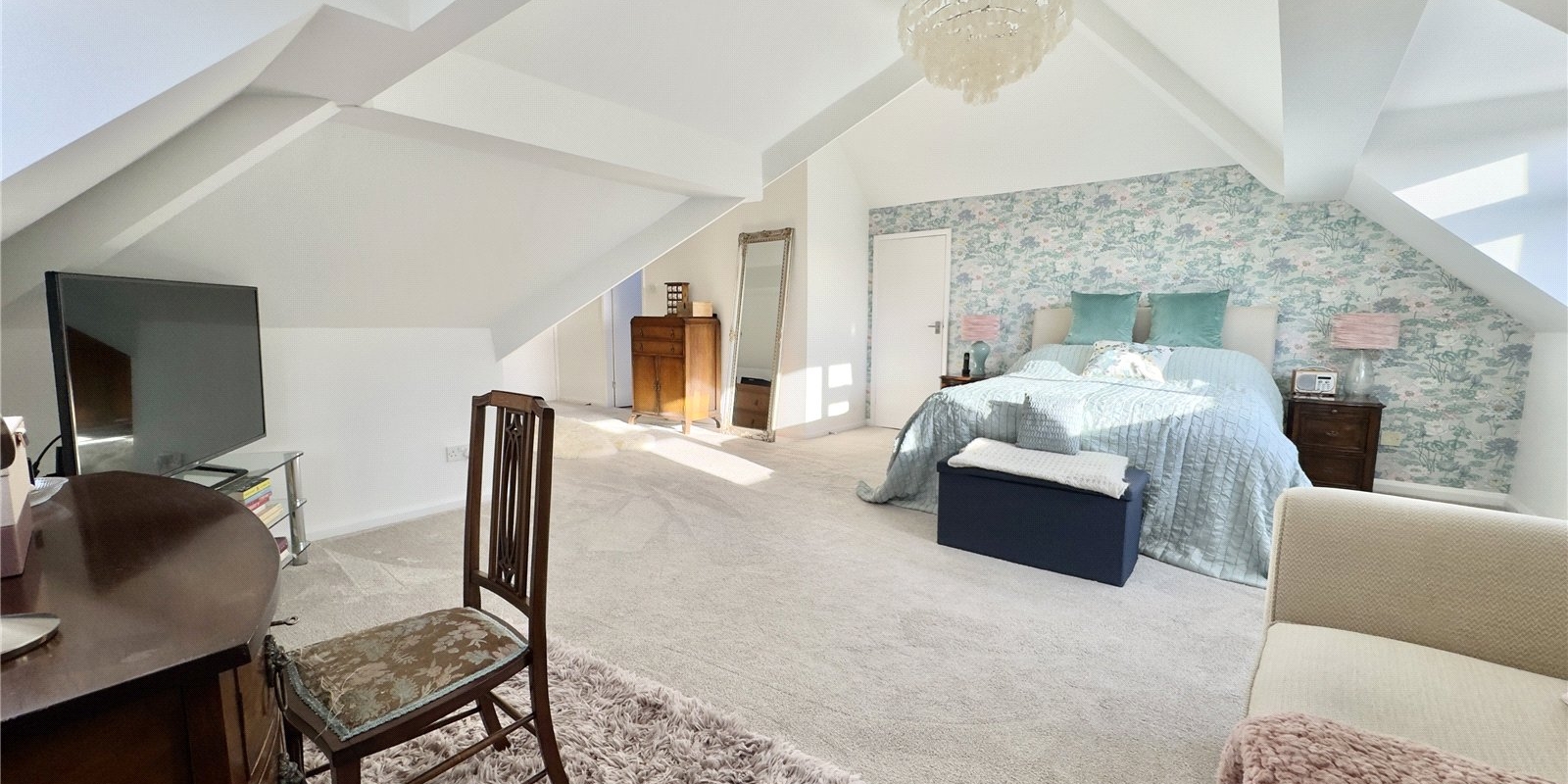 The first floor features an impressive principal bedroom with beamed ceilings and skylights, enjoying lovely views across the Dee Estuary and the Welsh hills. The principal bedroom also benefits from an en suite bathroom.