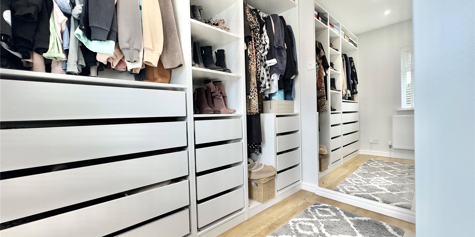 Upstairs, a generous landing connects two rear-facing bedrooms with built-in wardrobes and a family bathroom featuring both a bath and a separate shower. To the front, the master bedroom benefits from a modern en-suite and direct access to a fourth bedroom, currently configured as a dressing room but easily returned to a bedroom or nursery.