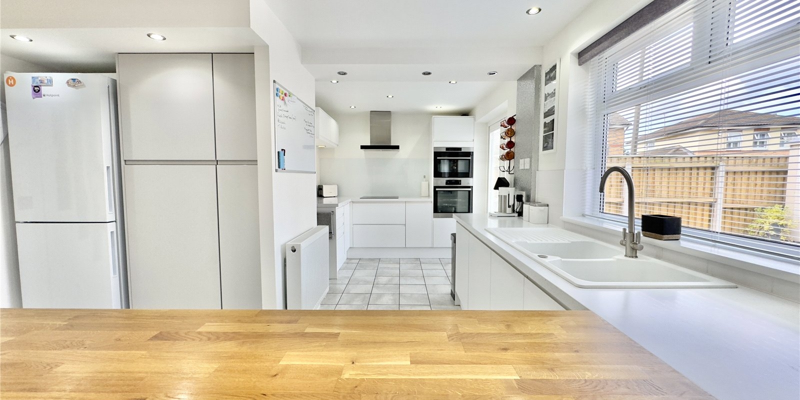 At the heart of the home lies a stylish kitchen, featuring sleek white units, integrated appliances, premium stone worktops, and a contrasting wooden surface. This open-plan layout flows effortlessly into the dining area and gives access into a bright garden room with patio doors leading out to the rear garden, creating a seamless indoor-outdoor living space. A second ground floor WC and a partitioned area offer the potential to reinstate an en-suite, allowing for the creation of a private ground-floor bedroom if desired.