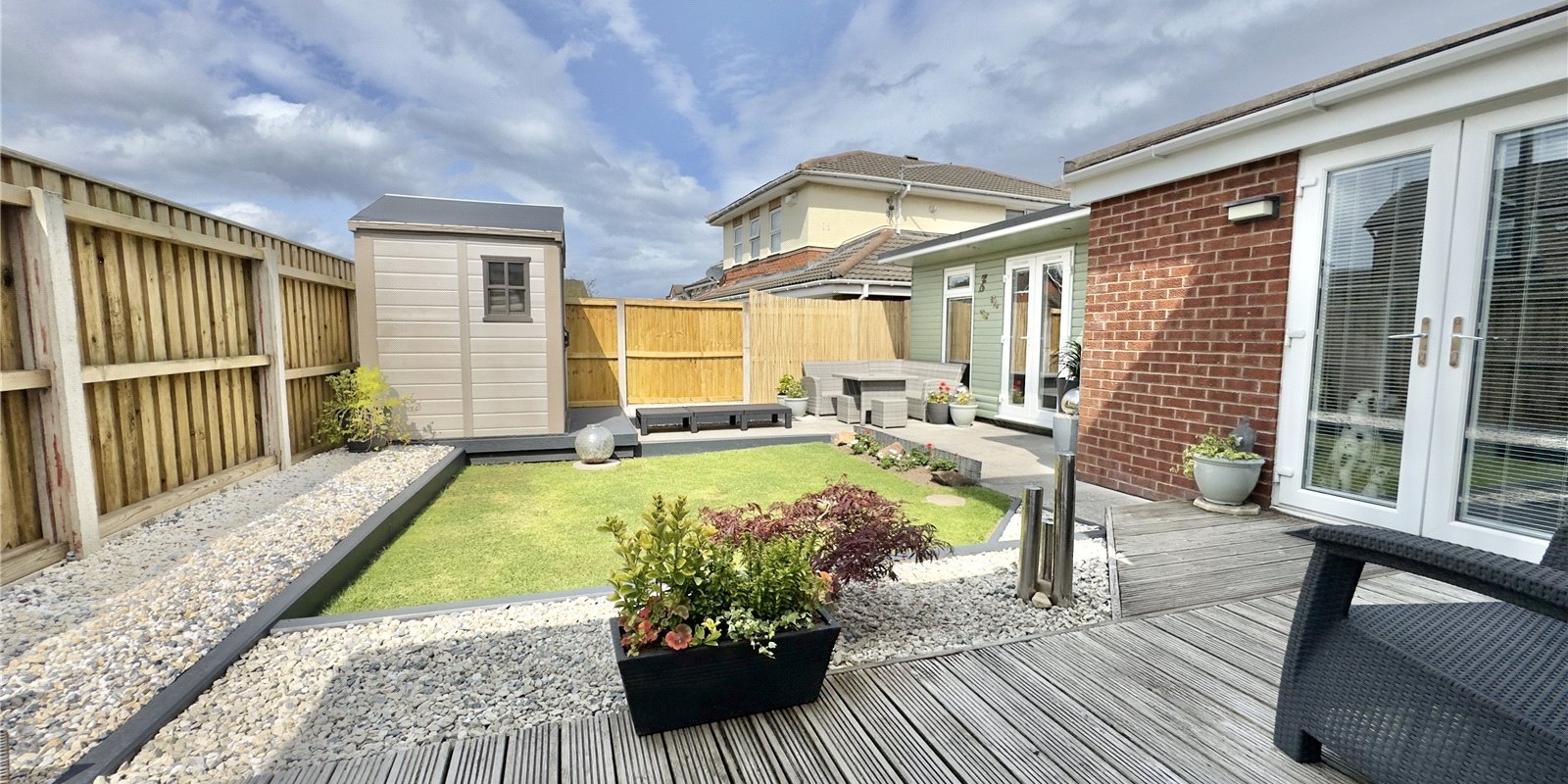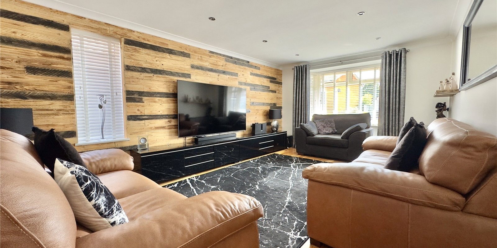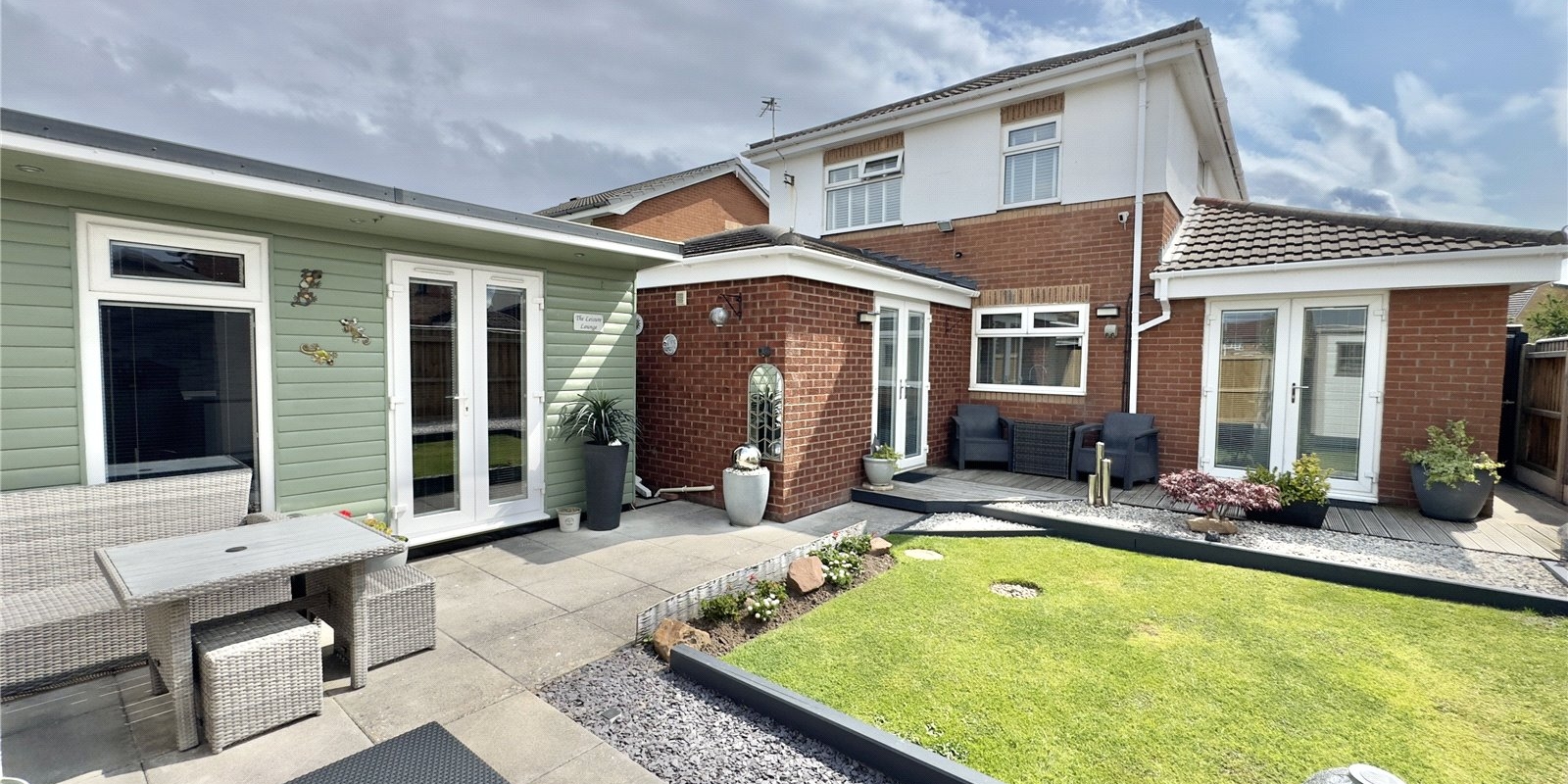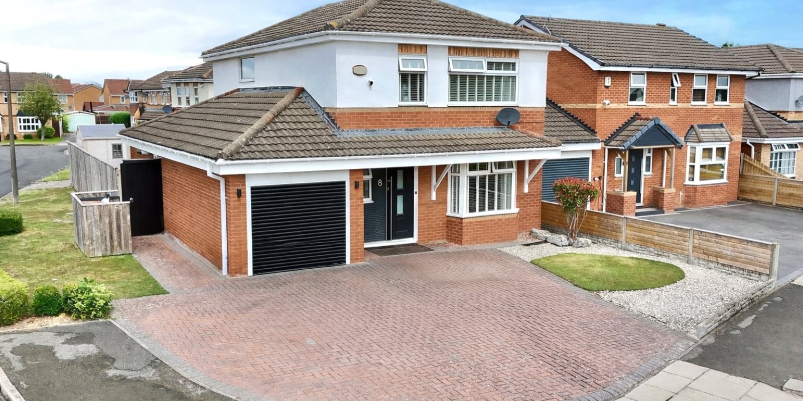 Outside, the home boasts a low-maintenance front garden and a spacious driveway with ample off-road parking and garage access. The private rear garden is beautifully landscaped and includes a fully equipped, heated bar—offering a unique and inviting space for entertaining in all seasons.