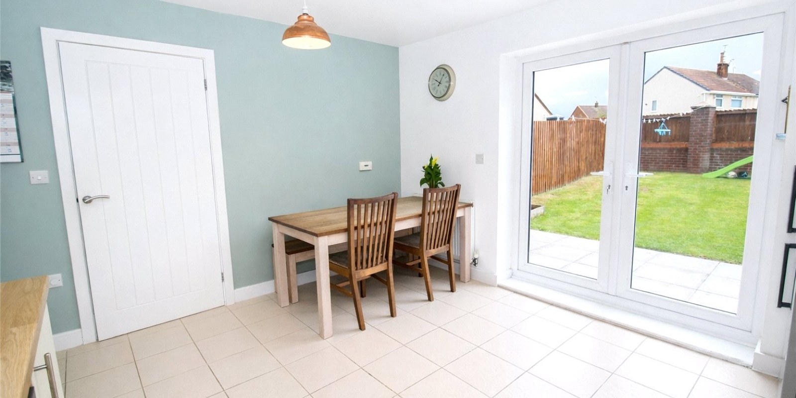 Inside, the accommodation is thoughtfully laid out. The ground floor comprises a welcoming entrance hallway leading into a generous living room, perfect for everyday comfort. To the rear, a contemporary dining kitchen provides a fantastic social space, complete with patio doors that open directly onto the garden, allowing plenty of natural light to flood in. A separate utility room and convenient downstairs WC complete the ground floor.