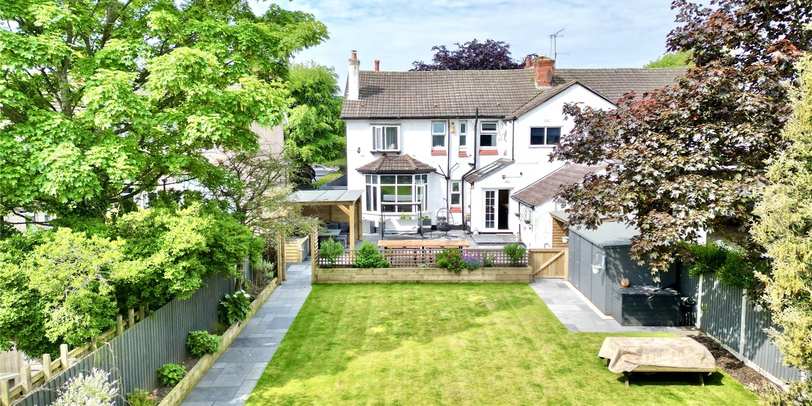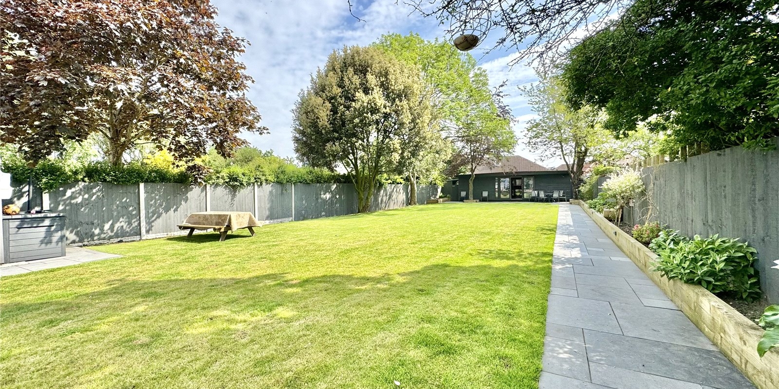 A pathway then stretches the length of the garden, making way for a show-stopper of a garden bar with ample floor space for a full-size snooker table, boasting a custom bar and entertainment area.