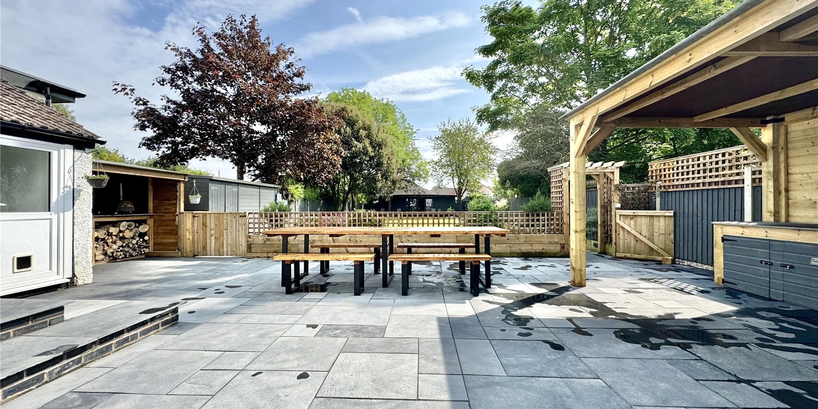 The extensive gardens offer raised borders brimming with an array of shrubbery, canopies with cooking stations ideal for a pizza night or family barbecue with a log store ready for the chillier evenings.