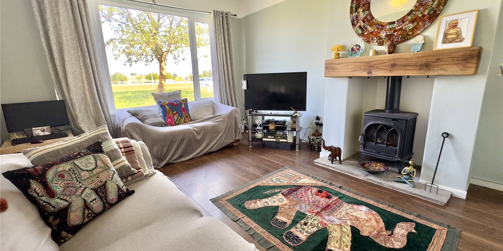 The ground floor features a spacious and inviting living room, bathed in natural light from a large picture window and centred around a striking wood-burning stove with a rustic timber mantel. The space is thoughtfully decorated with warm textures and eclectic touches, including a vibrant elephant-themed rug and hand-crafted soft furnishings that add personality and warmth.