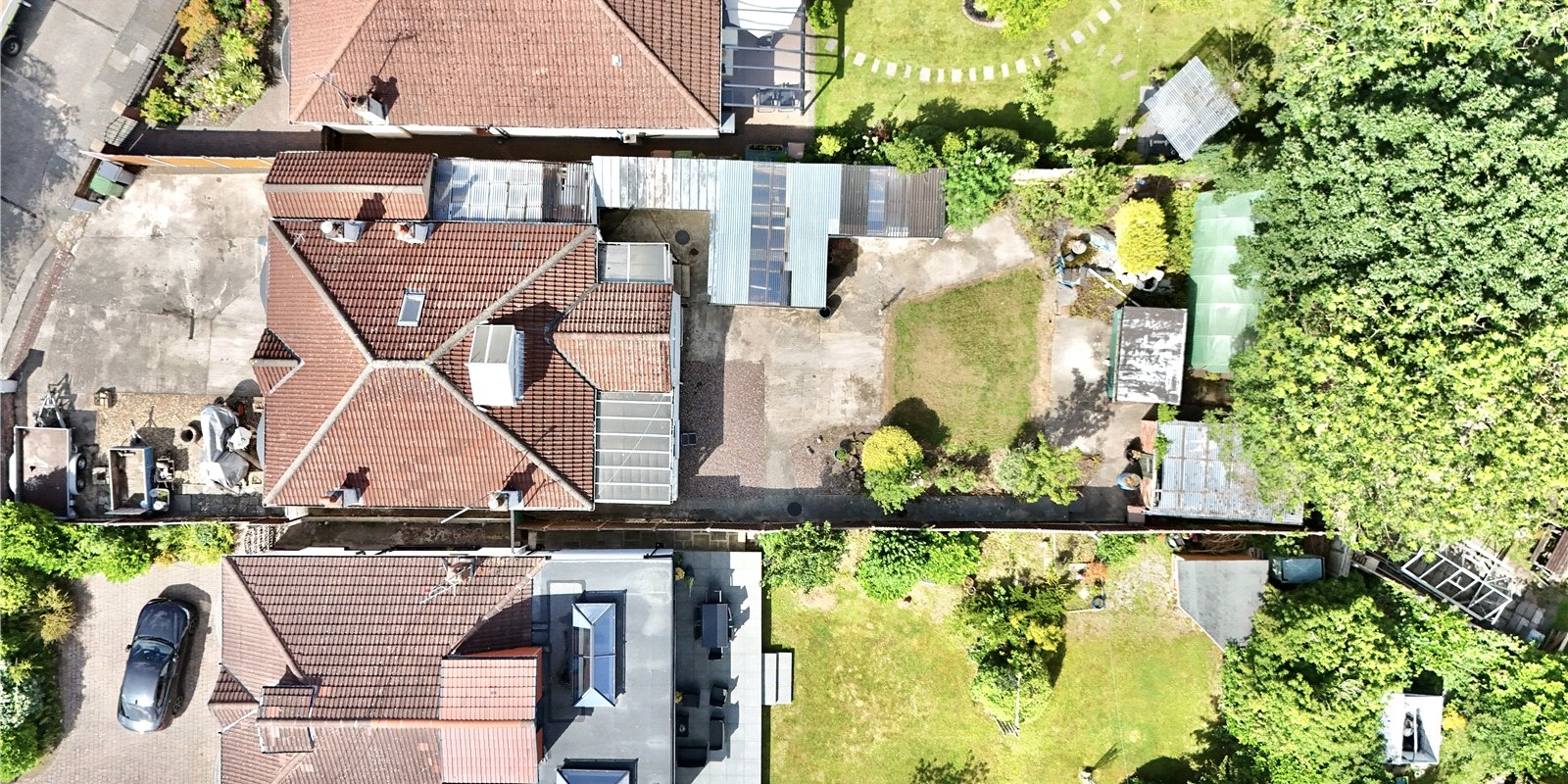 Externally, the rear garden is a standout feature—private and well-sized, it is divided into several distinct areas including a lawn, multiple patios, and a variety of outbuildings. A large workshop is connected to the garage via a covered carport, and several sheds offer additional storage or workspace. Tall, mature trees at the back of the garden provide privacy and a peaceful, secluded feel, creating an ideal outdoor retreat.