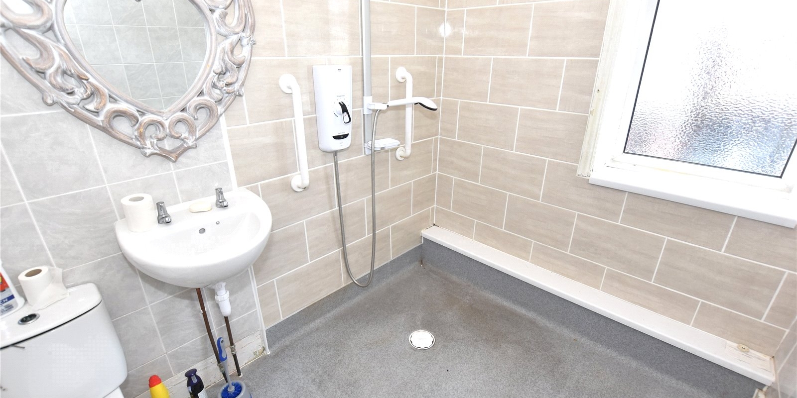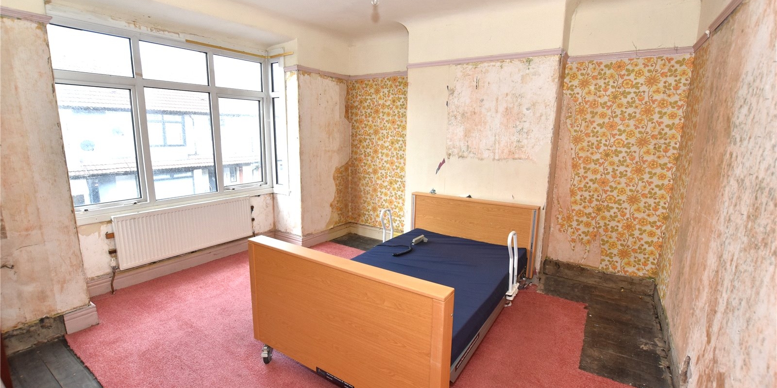 Upstairs, the property offers three good-sized bedrooms and a walk-in shower room, all accessed from a central landing. The home retains high ceilings and period character throughout, offering a solid base for cosmetic updating.