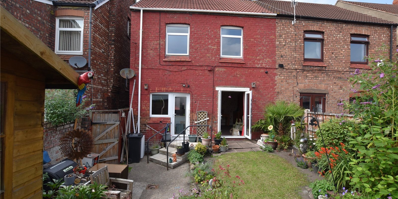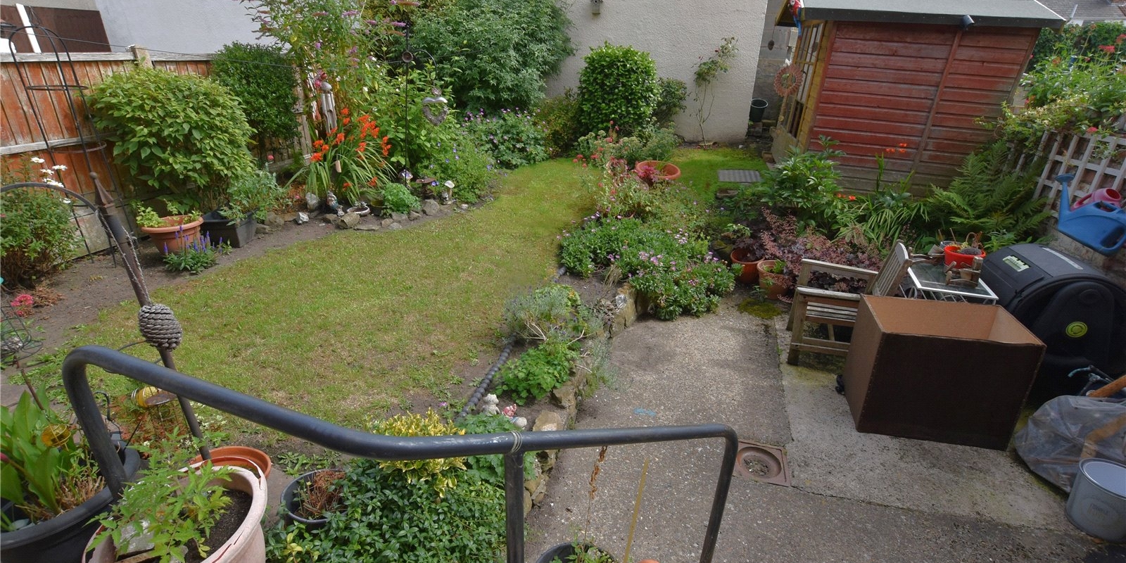 Externally, the property boasts a rare and generous rear garden for this area, featuring a well-maintained lawn, colourful mature borders, a wooden shed, and steps down leading to a patio—ideal for outdoor relaxation or entertaining. Neatly planted flower beds enhances the front approach, giving the home standout curb appeal.