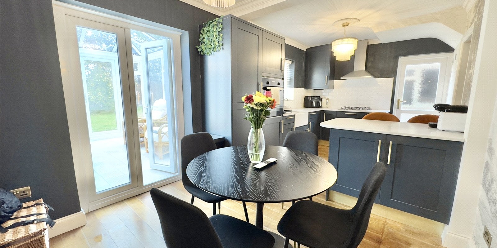 The heart of the home lies in the fully renovated kitchen and dining area, designed with timeless navy cabinetry, brushed gold fittings, white quartz worktops, and white tiled splashbacks. A breakfast bar provides casual dining space, while the open-plan layout flows into a defined dining area with patio doors through to the conservatory—an additional seating area that enjoys lovely views over the rear garden. The kitchen also features a butler sink and integrated appliances for added convenience and style.