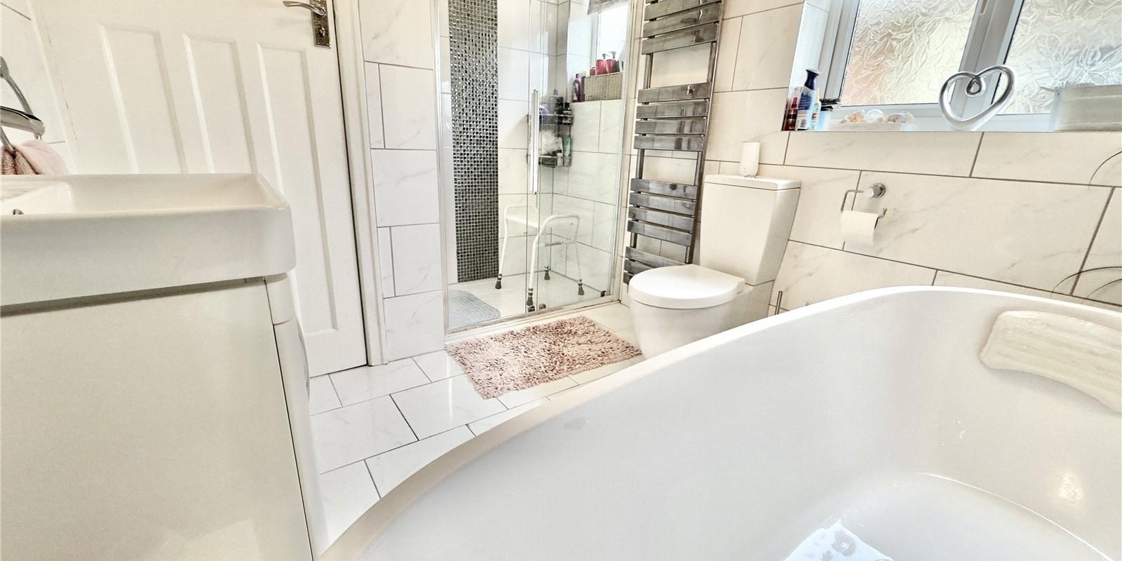 The family bathroom is a true sanctuary, designed with luxury in mind. A freestanding bath complete with built-in TV, alongside a spacious walk-in shower, creates the perfect combination of style and indulgence.