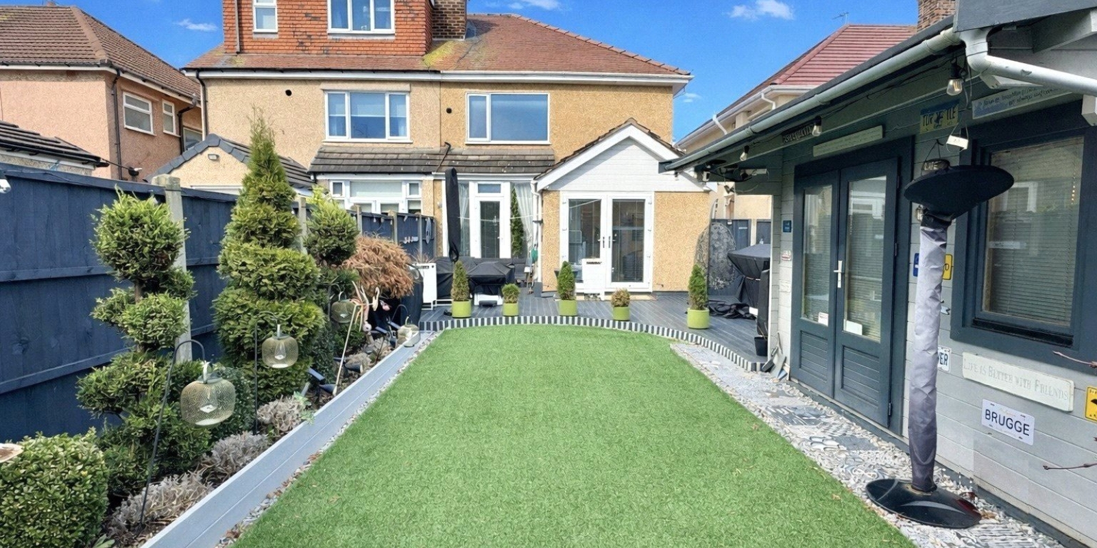 The decking offers multiple areas for seating and relaxation, while artificial turf ensures a low-maintenance yet visually appealing space.