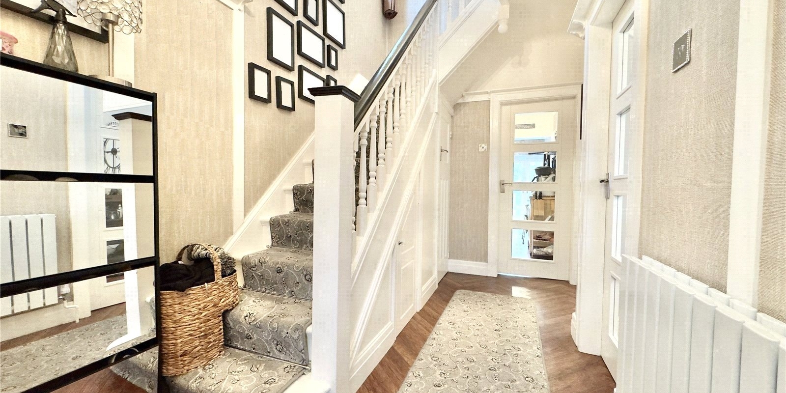Step inside to a welcoming hallway that immediately sets the tone for this bright and airy home. To the right, a versatile reception room, currently styled as a dining area, invites gatherings and shared meals, bathed in natural light from the bay window, which is fitted with wooden blinds for a sleek finish.