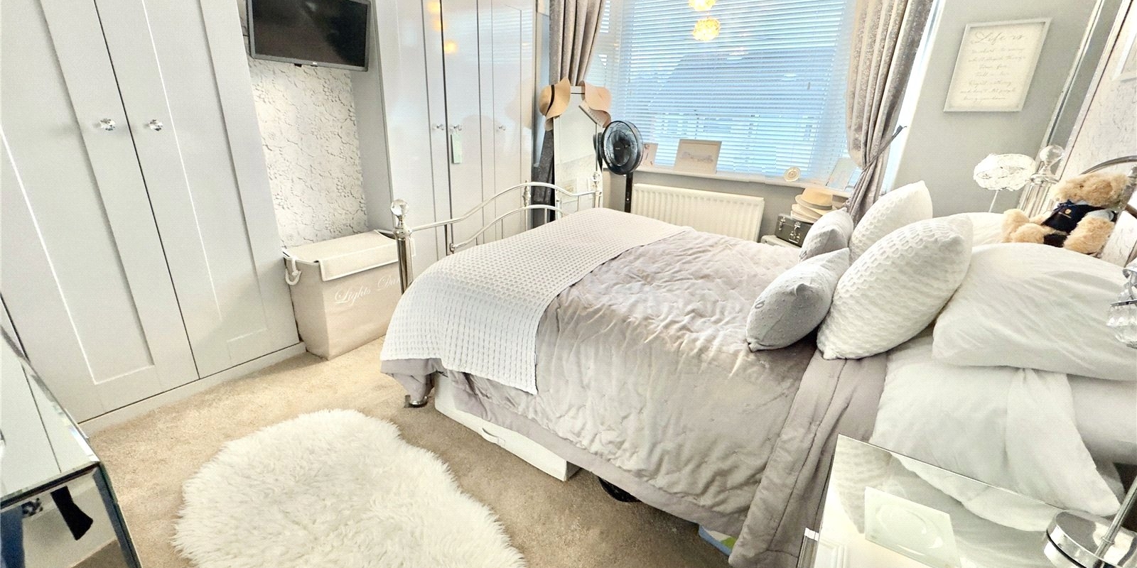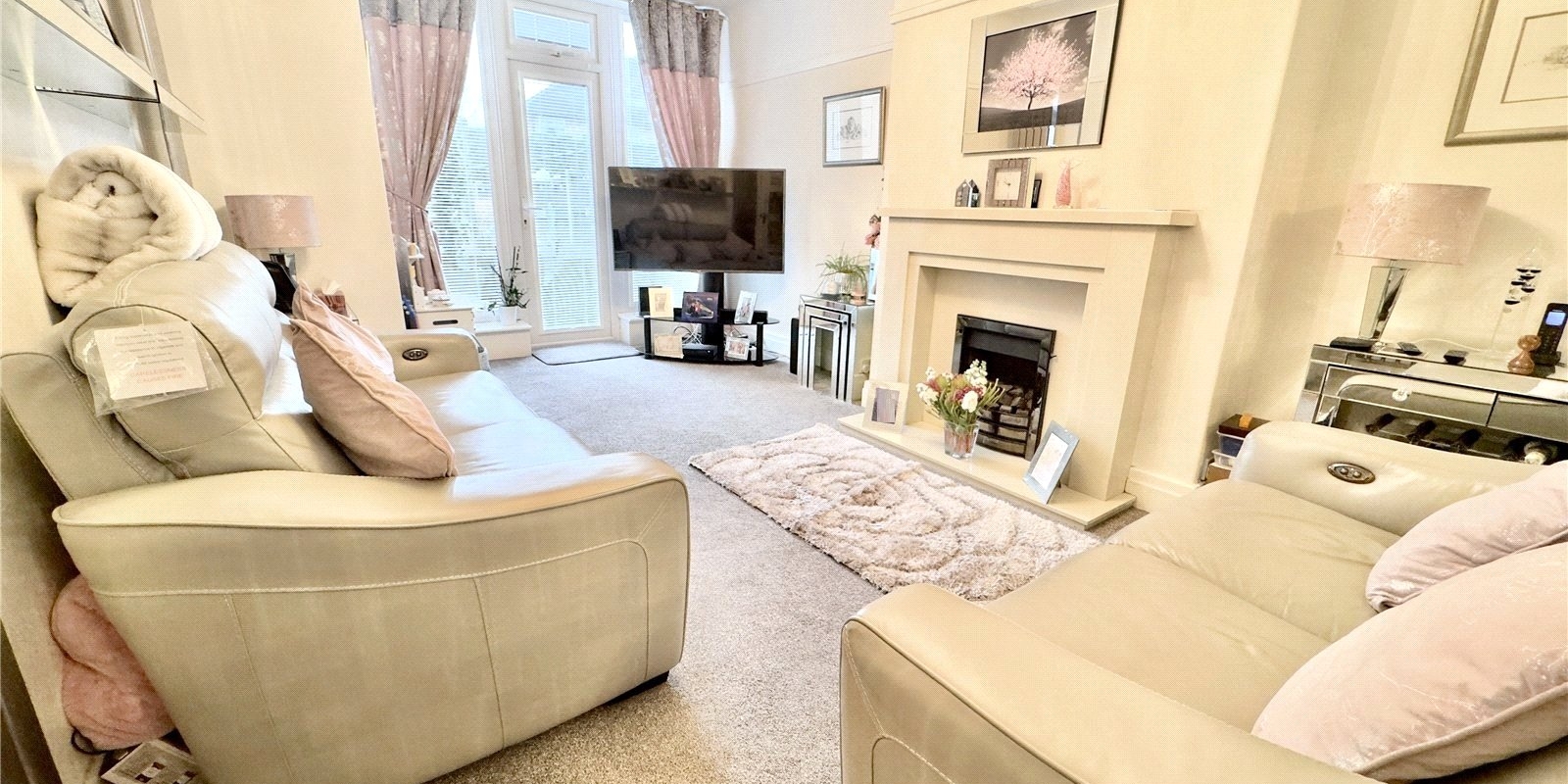 At the rear, a second reception room serves as a cosy living space with further access to the garden. This bright yet inviting room is finished with Perfect Fit blinds to the rear window and door and is complete with an elegant fireplace, creating a striking focal point and a warm, welcoming atmosphere.