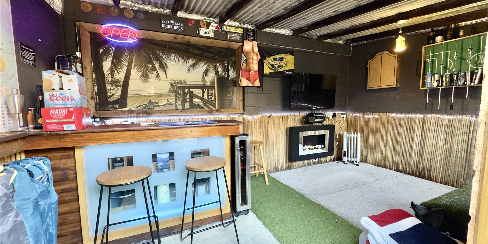 Externally, the rear garden has been designed with low maintenance in mind, providing a fantastic space to relax and entertain. A standout feature is the impressive garden bar – a superb addition that creates the perfect setting for social gatherings all year round. There is also patio seating space and artificial lawn, making it both practical and inviting. Additionally, the property benefits from a spacious cellar accessed directly from the garden, offering excellent storage potential or scope for further use subject to any necessary consents.