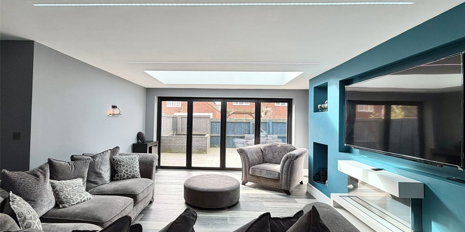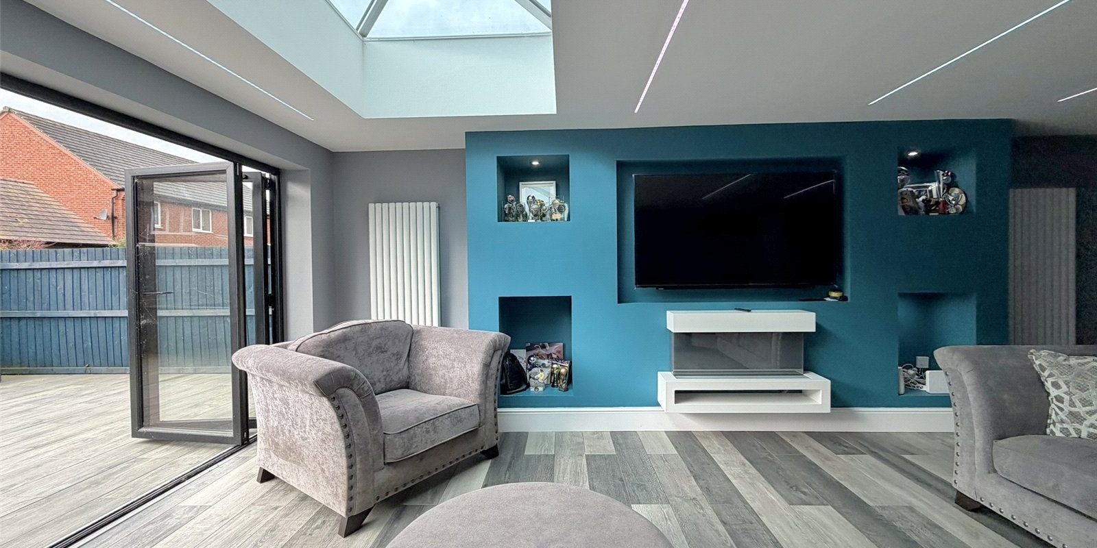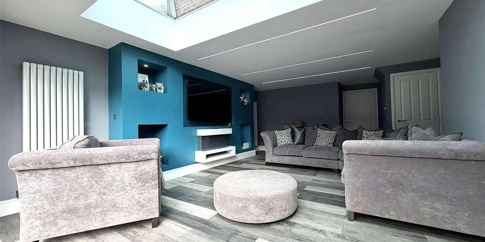 Upon entering the property, you are welcomed by a bright and inviting entrance hall which provides access to the downstairs WC, kitchen and living room. The living space is undoubtedly the standout feature of the home, designed with modern living in mind. Flooded with natural light from the impressive sky lantern and striking bi-fold doors, this superb room also boasts a stylish entertainment wall, creating the ideal environment for relaxing with family or hosting guests.