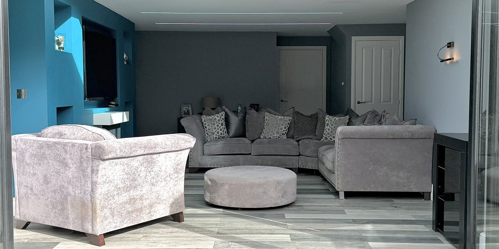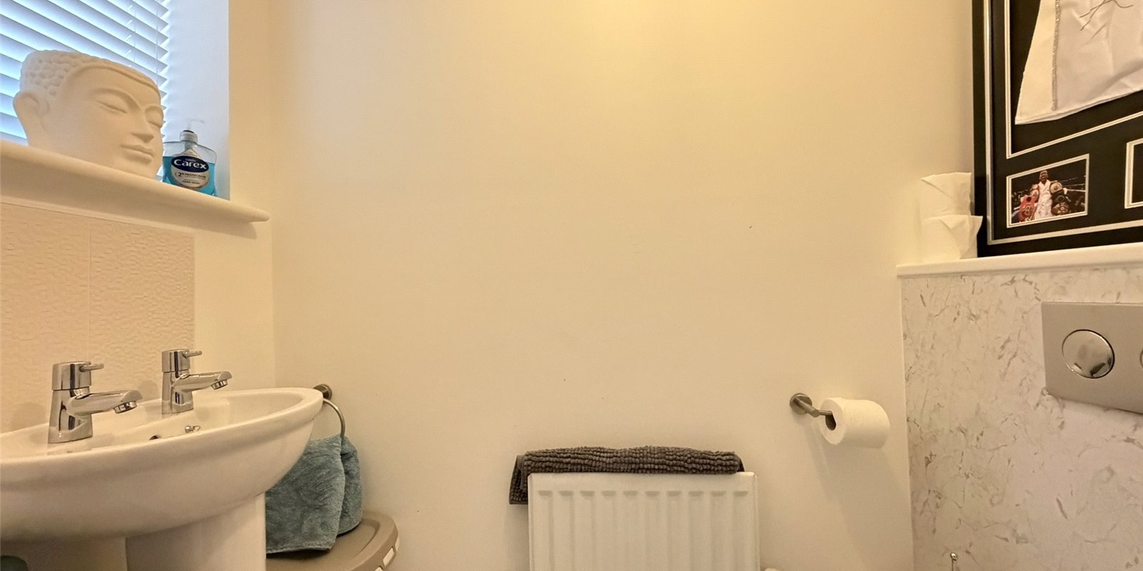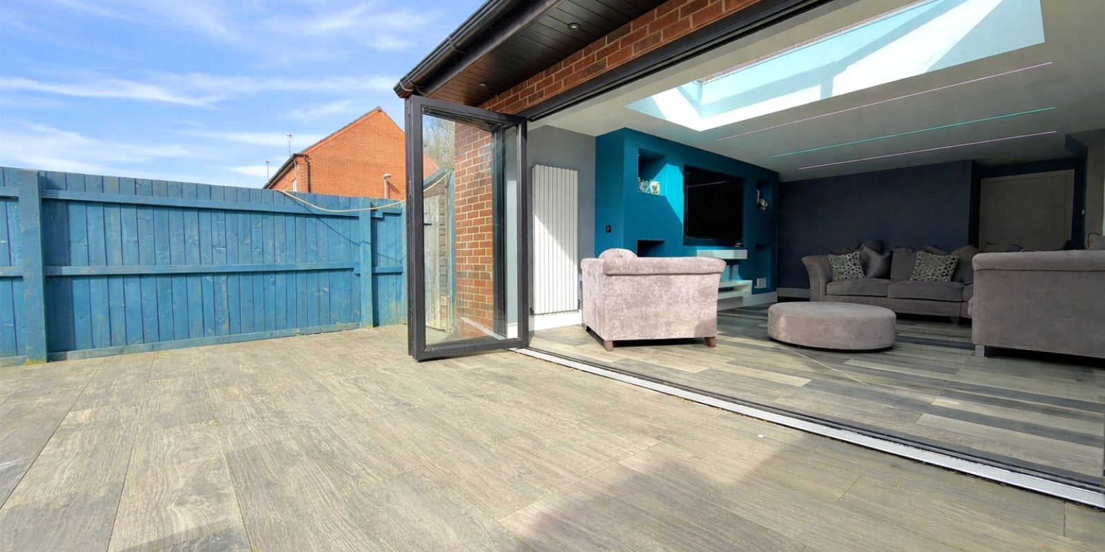 Upon entering the property, you are welcomed by a bright and inviting entrance hall which provides access to the downstairs WC, kitchen and living room. The living space is undoubtedly the standout feature of the home, designed with modern living in mind. Flooded with natural light from the impressive sky lantern and striking bi-fold doors, this superb room also boasts a stylish entertainment wall, creating the ideal environment for relaxing with family or hosting guests.