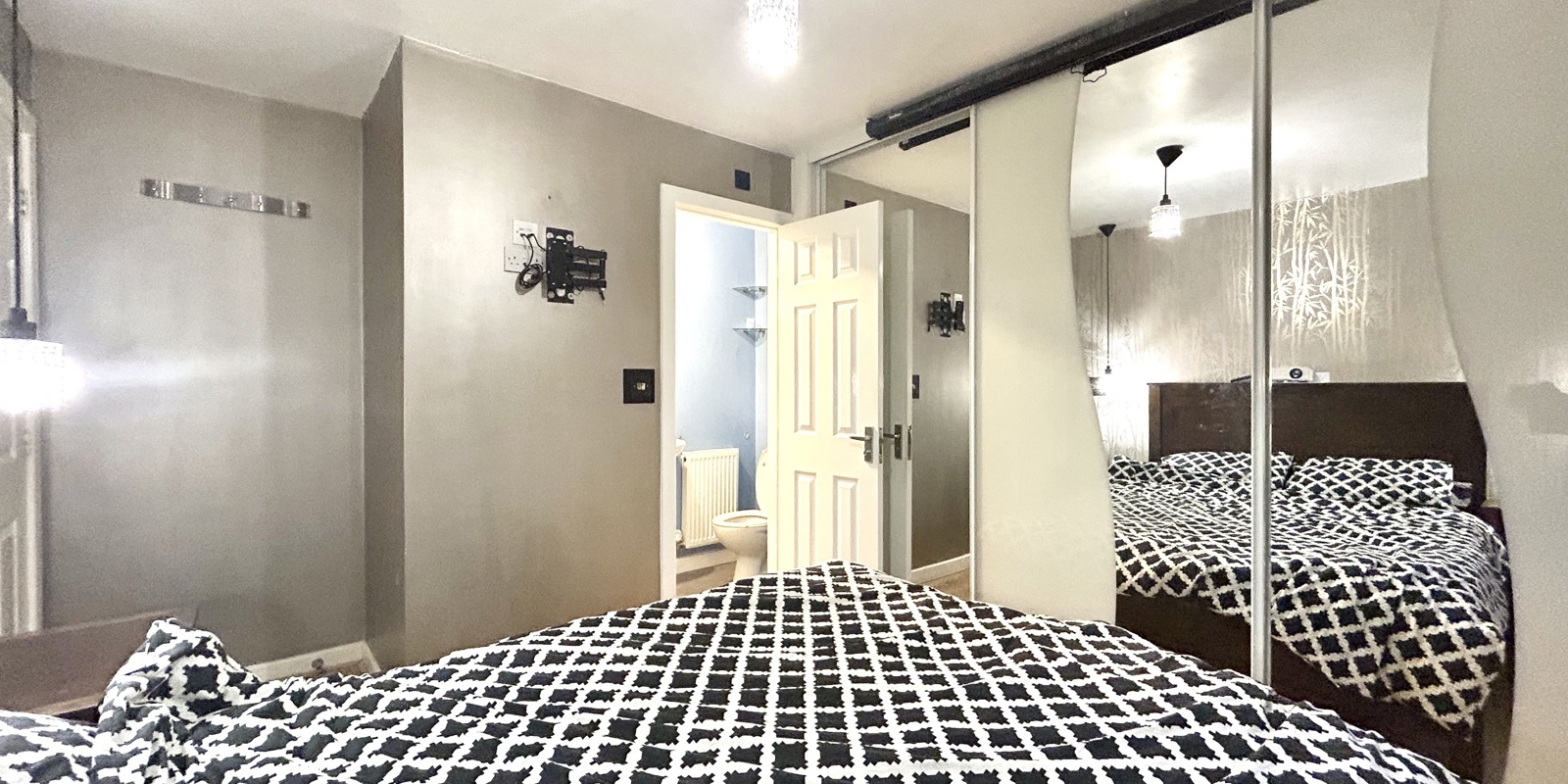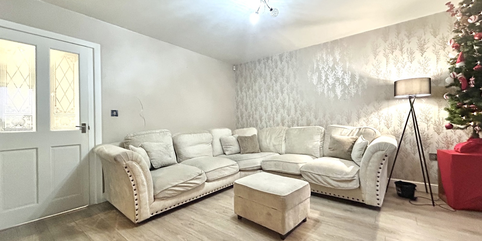 The staircase to the first floor is enhanced with feature acoustic wood panelling and integrated lighting, adding a contemporary design touch. The master bedroom benefits from an en-suite shower room, while bedrooms two and three are both well-proportioned doubles. The accommodation is completed by a modern three-piece family bathroom.