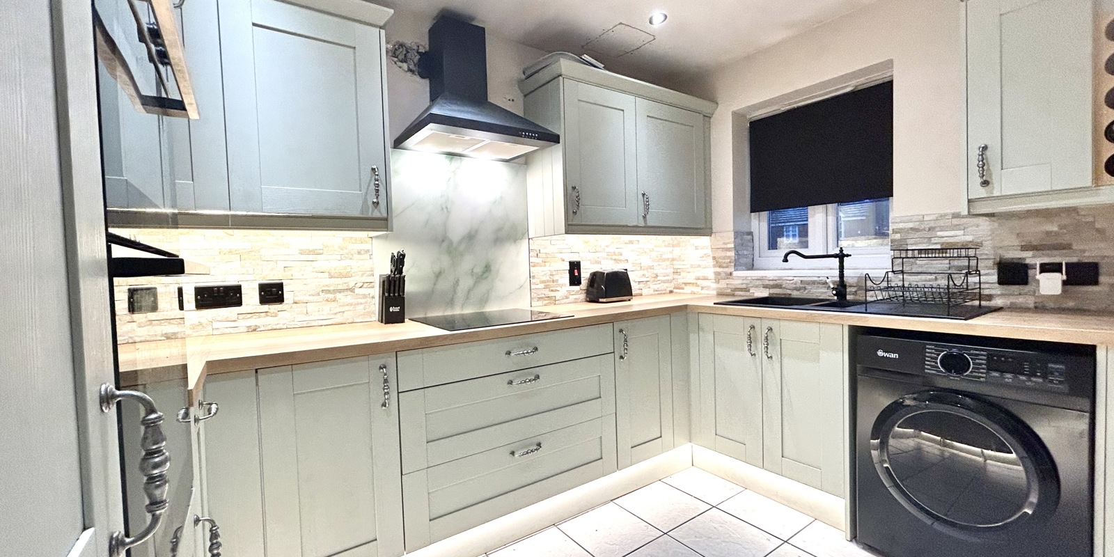 Upon entering the property, you are welcomed into a brand-new fitted kitchen, complete with integrated oven, hob and fridge/freezer, along with an abundance of cupboard and drawer storage. A small utility area leads through to the converted garage, currently utilised as a music room, offering flexible additional living space.