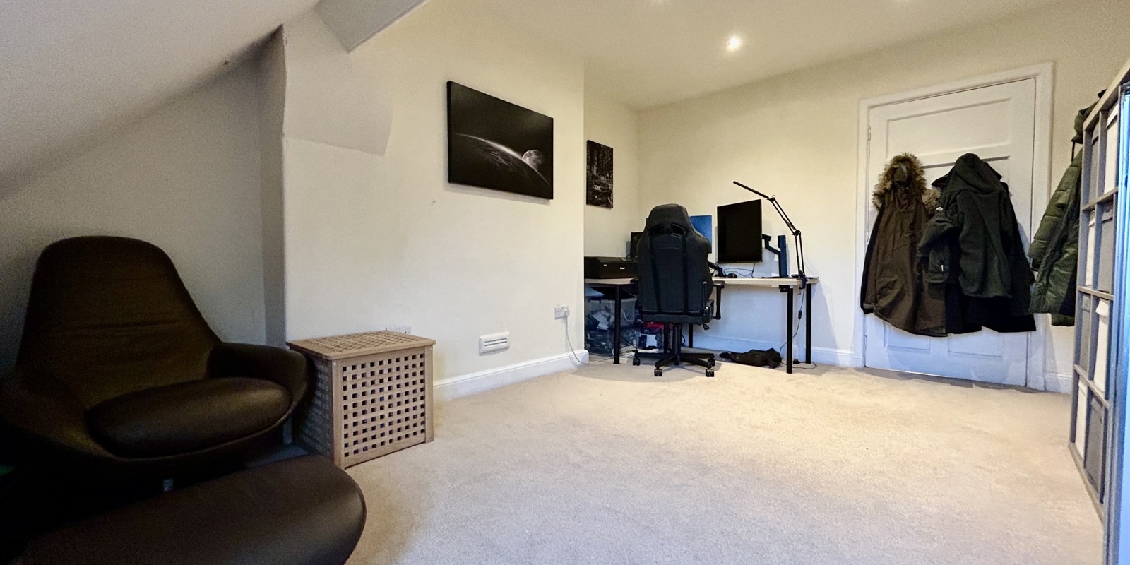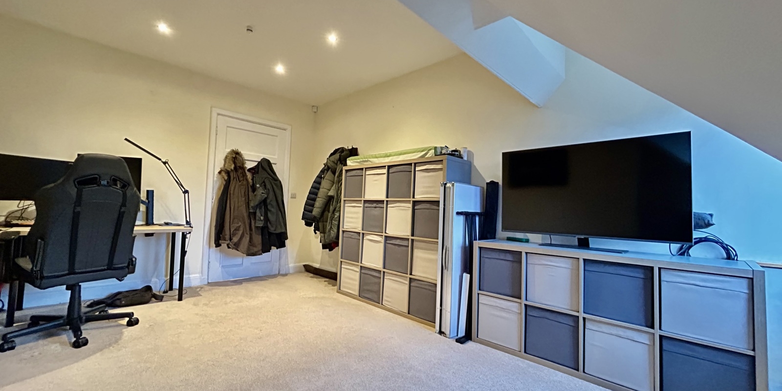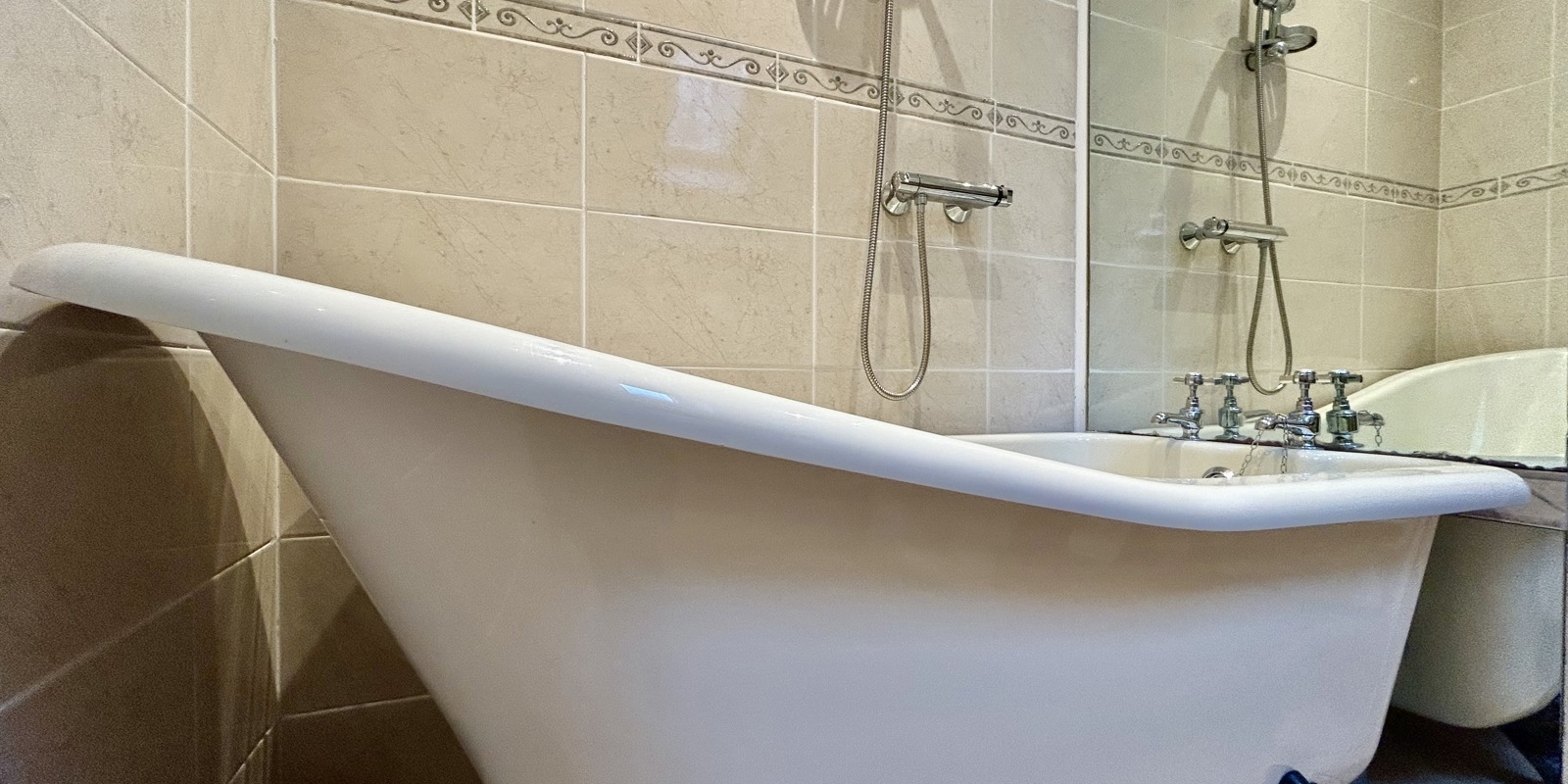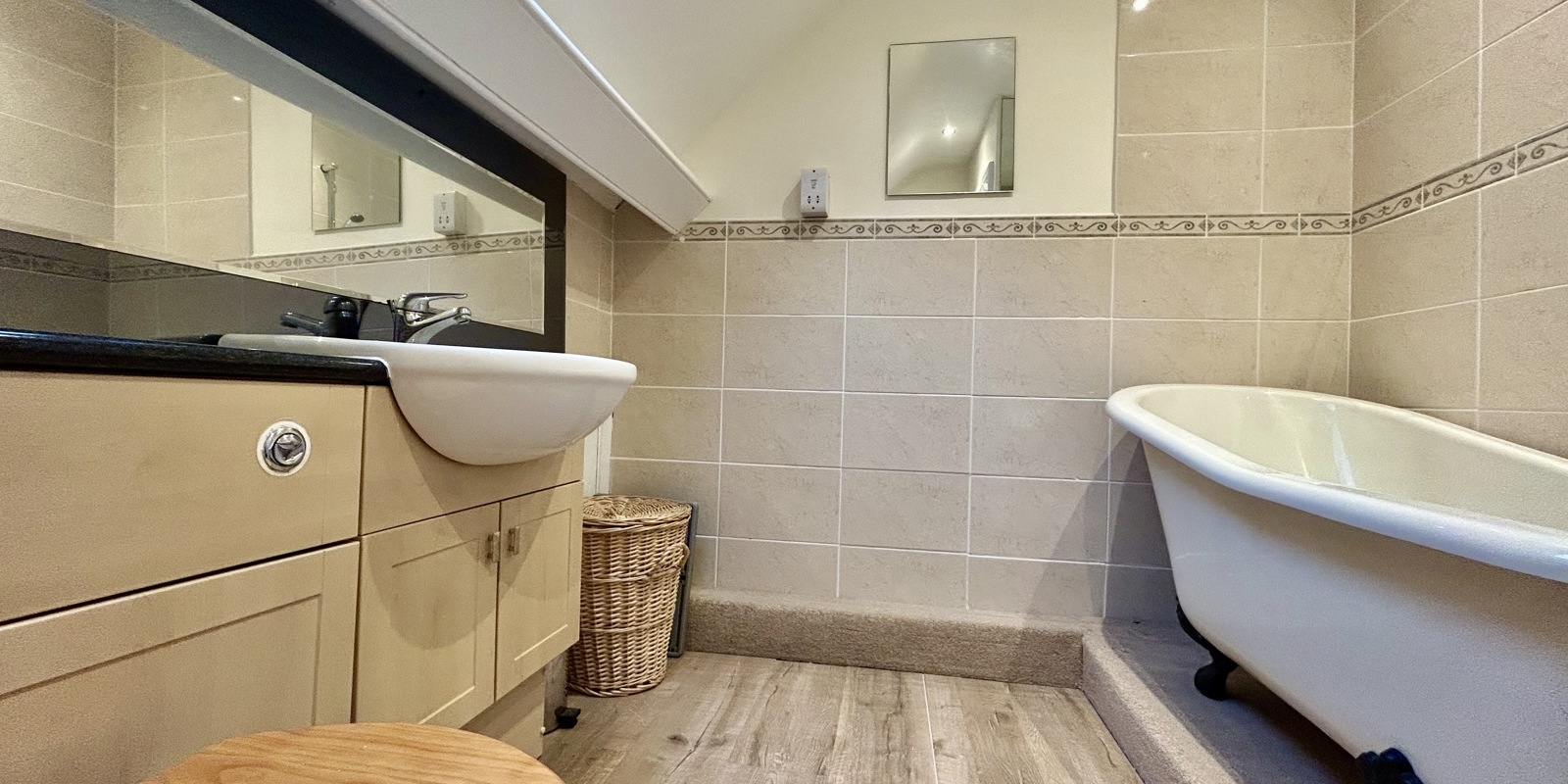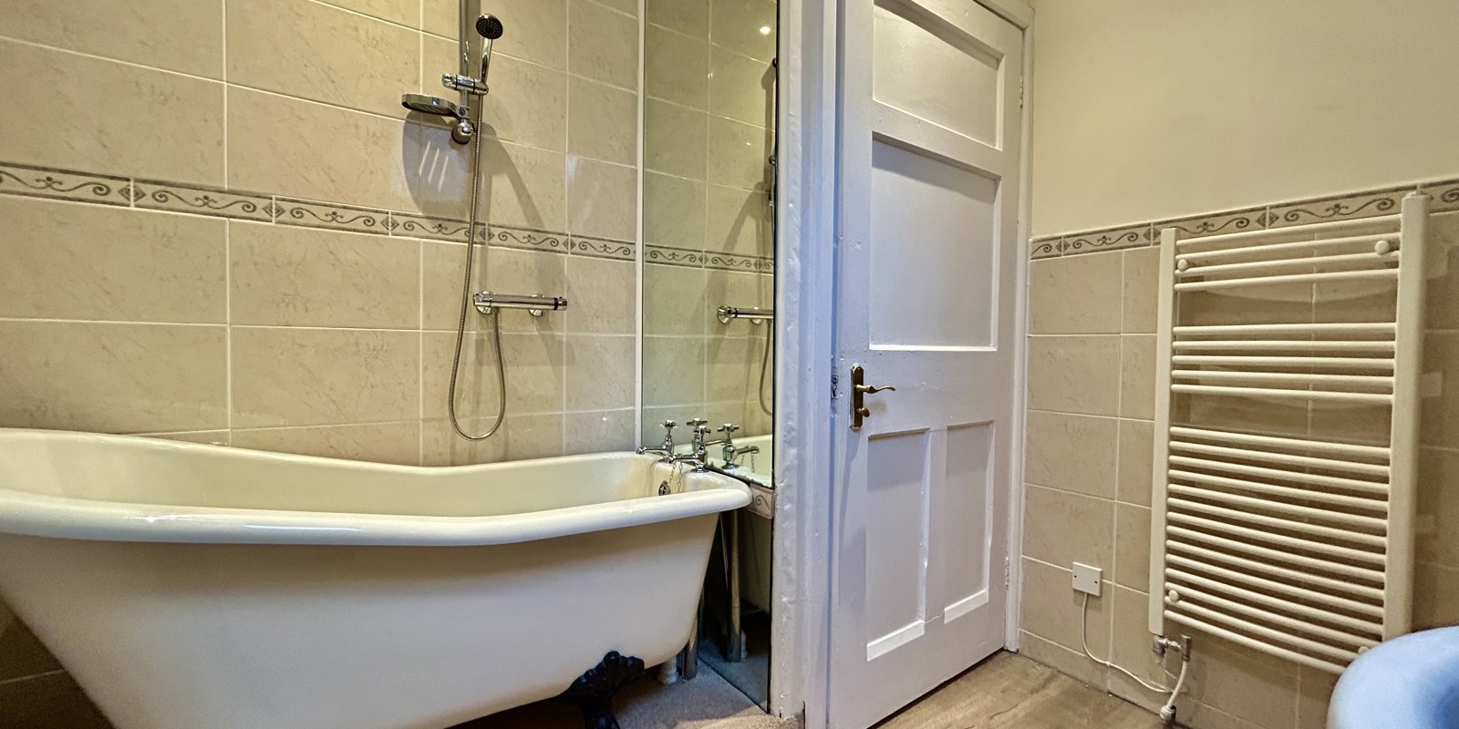 A modern fitted kitchen is complemented by a separate utility and storage room, ideal for keeping everyday living clutter-free. The principal bedroom is a true highlight, boasting dual-aspect windows and a luxurious en-suite bathroom featuring a striking roll-top claw-foot bath with shower over.