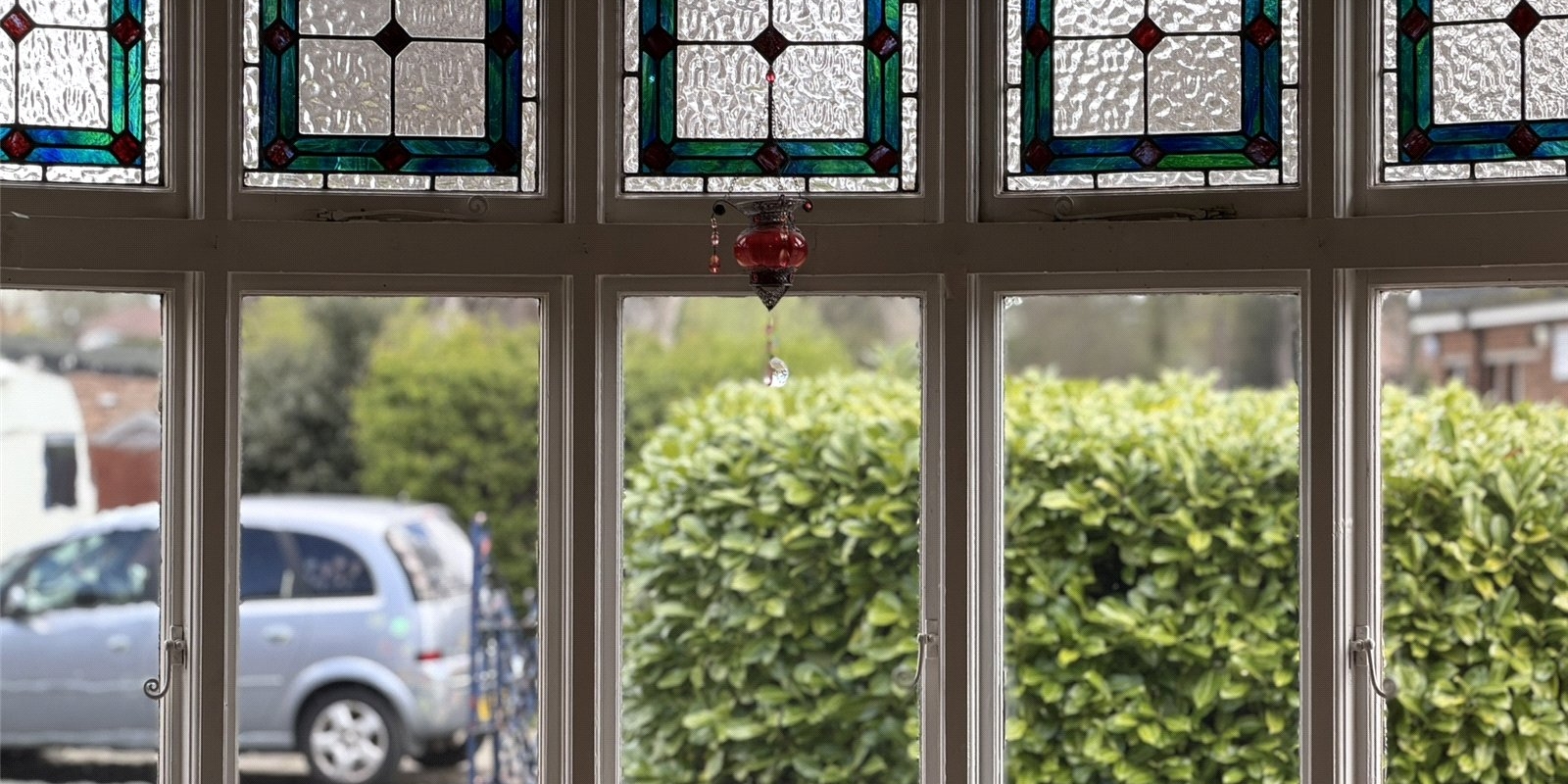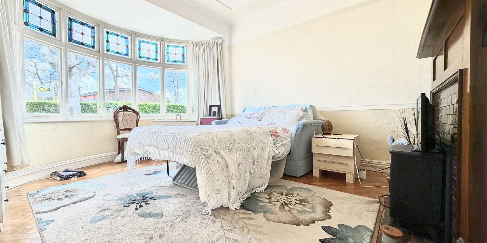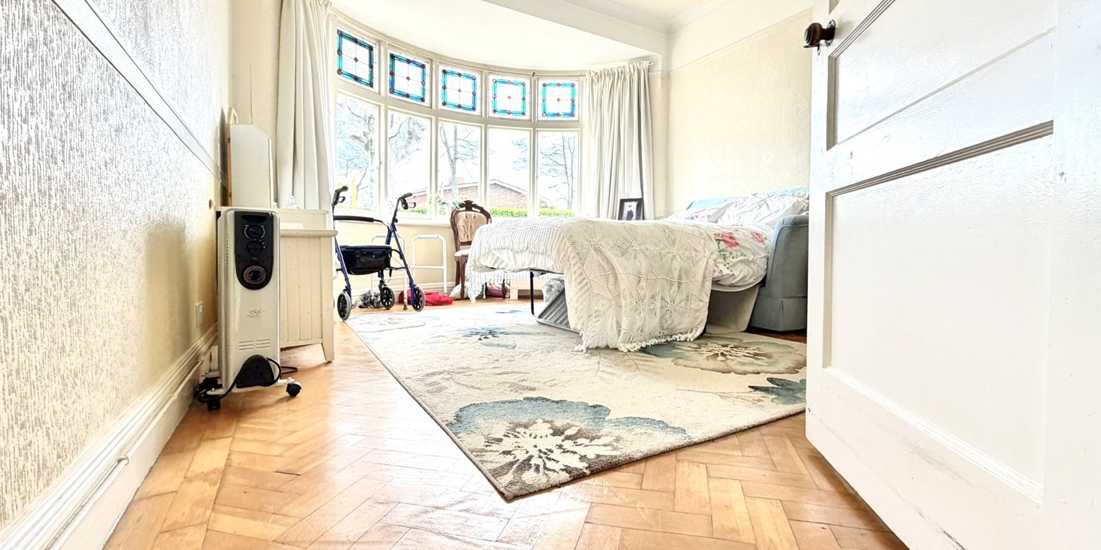 The ground floor comprises an entrance porch leading into a substantial lounge/dining room stretching the full length of the property, enhanced by a beautiful bow-bay window with stained glass detailing to the front and French doors opening onto the rear garden. An inner hallway provides access to a second reception room, currently utilised as a bedroom, featuring parquet flooring and an original fireplace, along with a downstairs bathroom, staircase to the first floor, and access to the kitchen positioned at the rear with direct garden access.