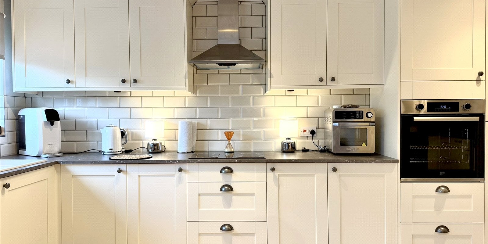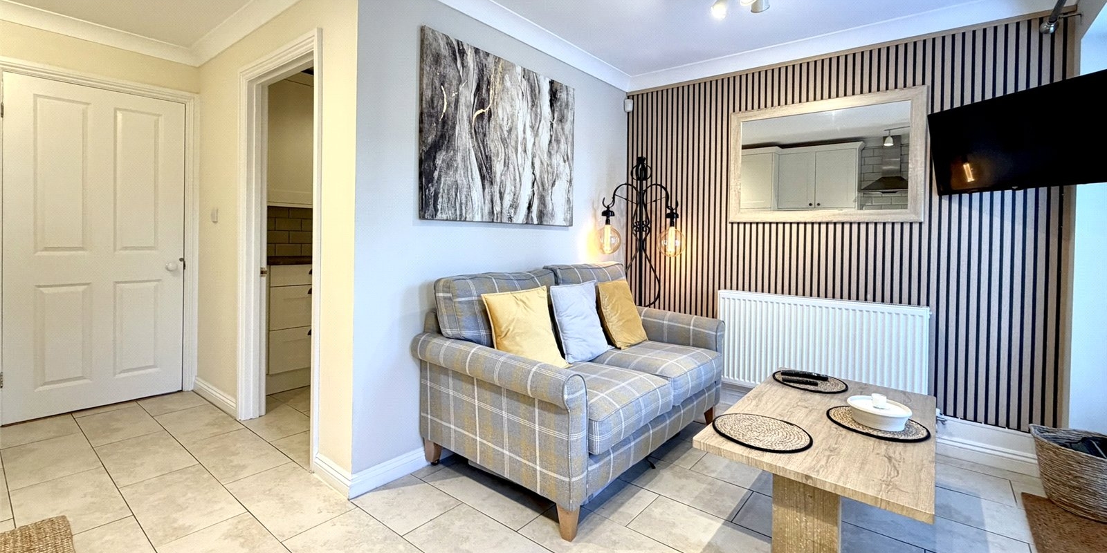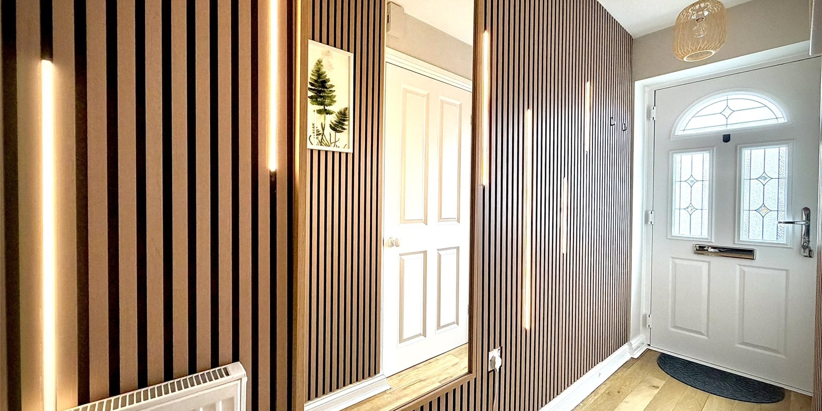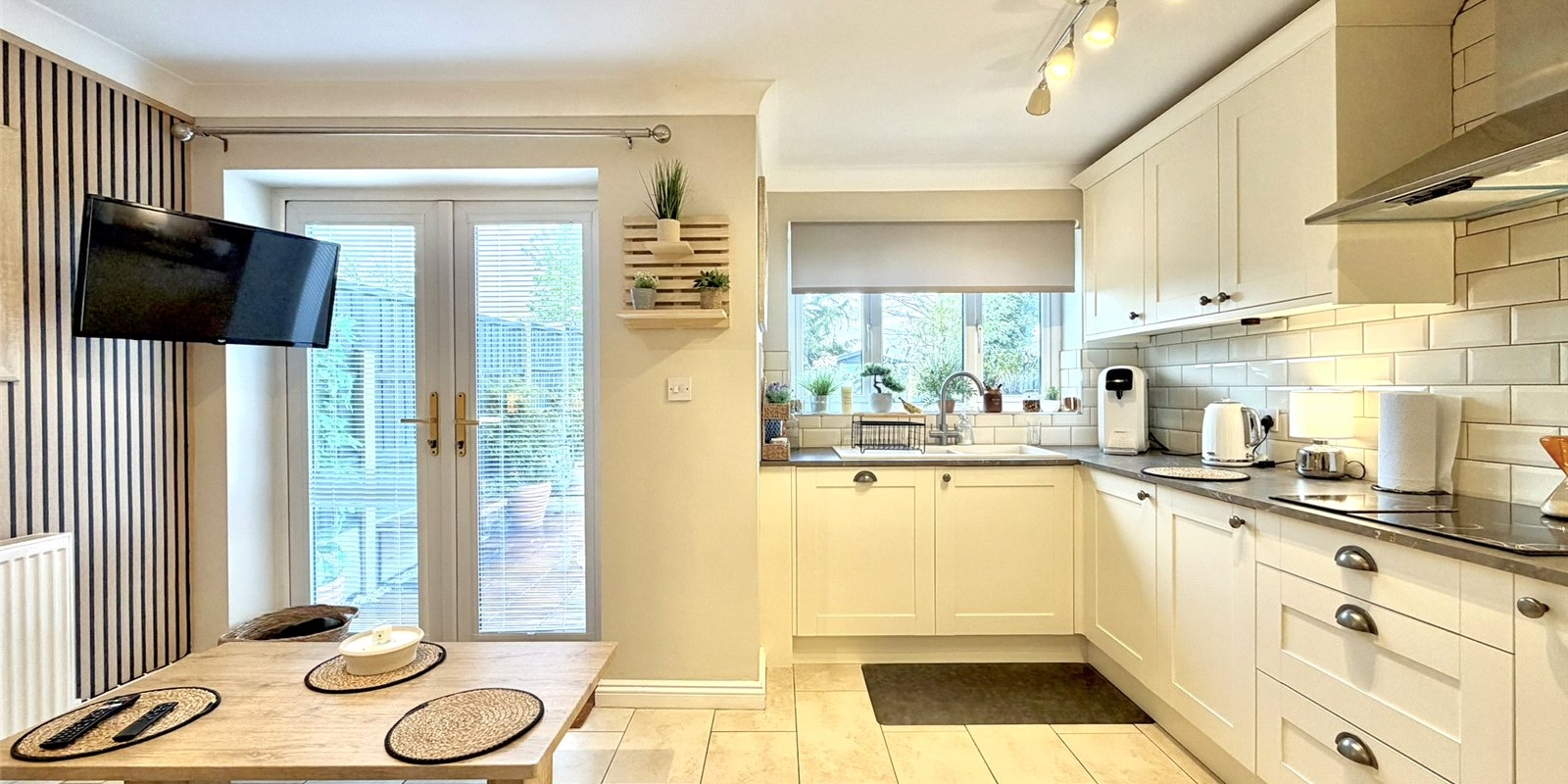 Internally, the property welcomes you with a stylish entrance hallway featuring contemporary acoustic wall panelling and ambient lighting, setting the tone for the quality found throughout. A convenient downstairs WC and staircase lead from the hallway, with access into a bright and airy lounge complete with engineered wood flooring and a feature electric fireplace. To the rear, the home opens into a stunning kitchen/dining/living space, designed in a modern country style and ideal for entertaining, complemented by a useful utility room and understairs storage. Double French doors lead seamlessly onto the landscaped rear garden.