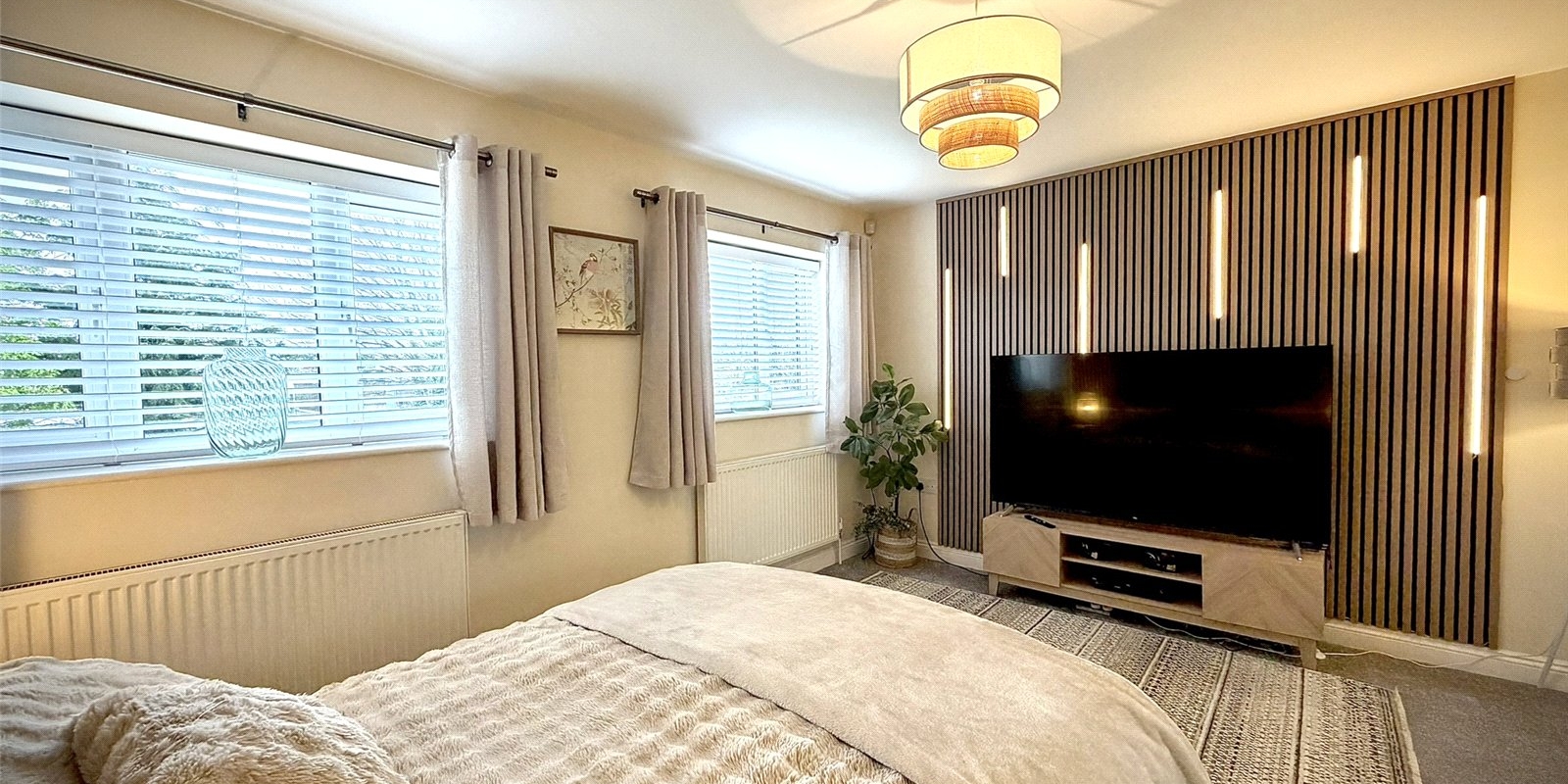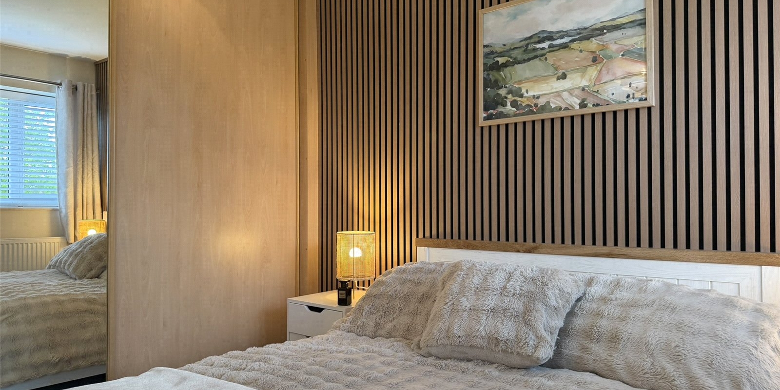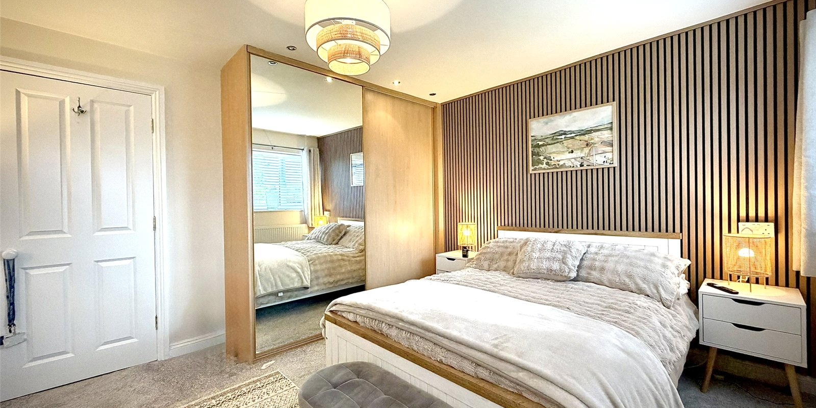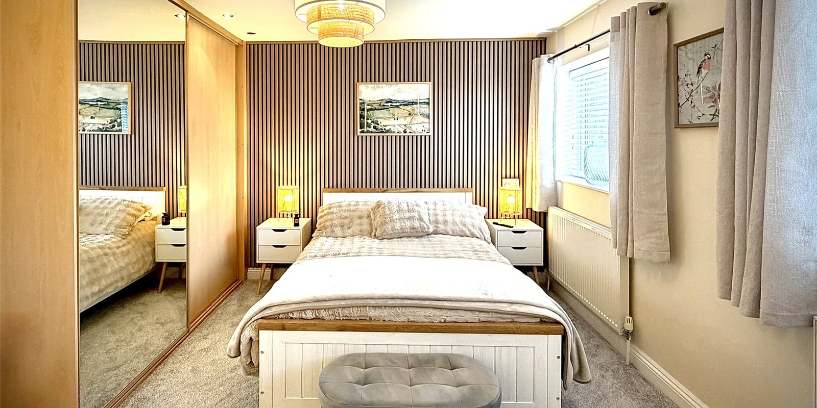 Upstairs, the spacious landing provides access to three well-proportioned bedrooms. The principal bedroom spans the full width of the property and benefits from dual aspect windows overlooking the garden, bespoke fitted wardrobes, and feature acoustic panelling. The second bedroom is a generous double with feature wall, while the third is a well-sized single. A modern family bathroom completes the first floor.